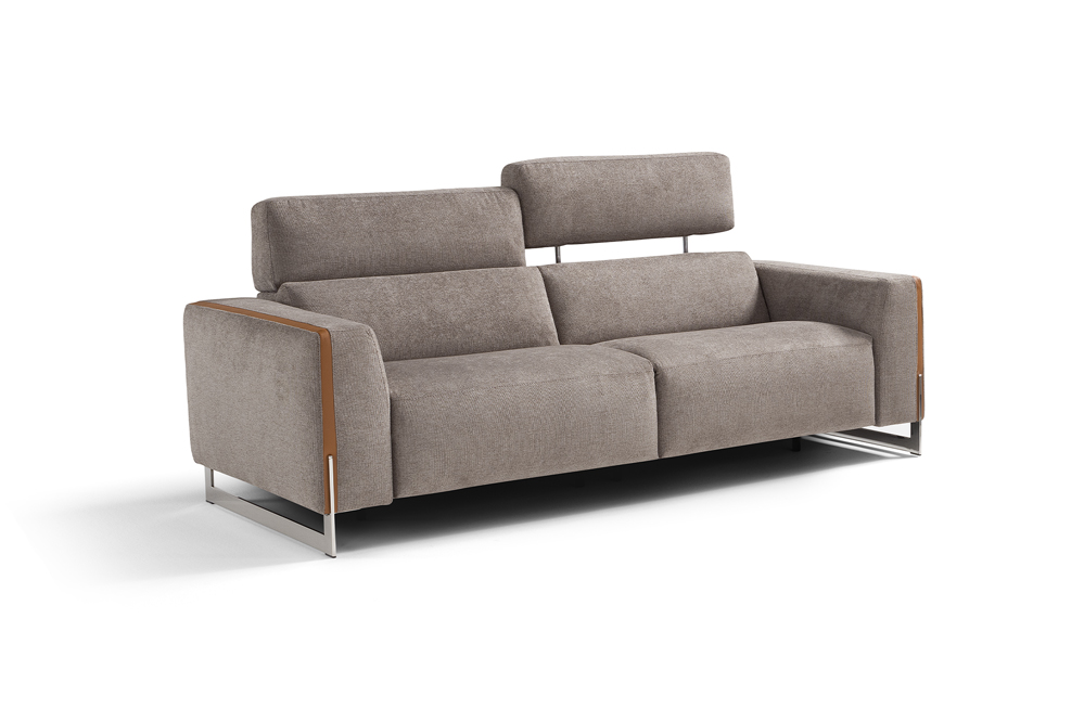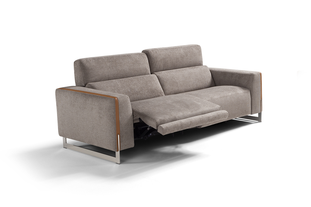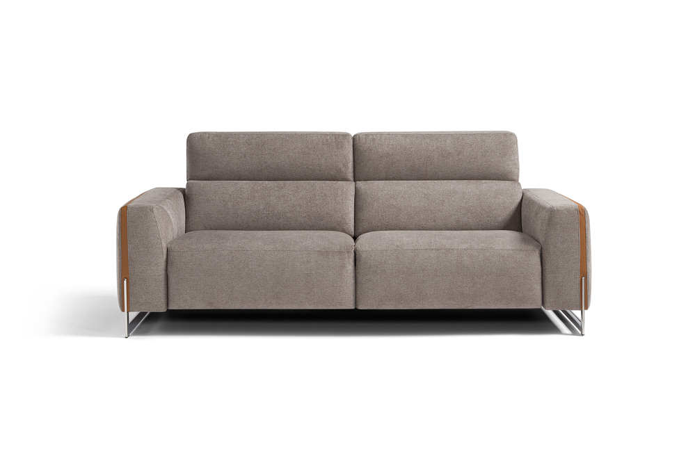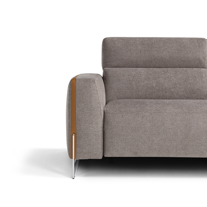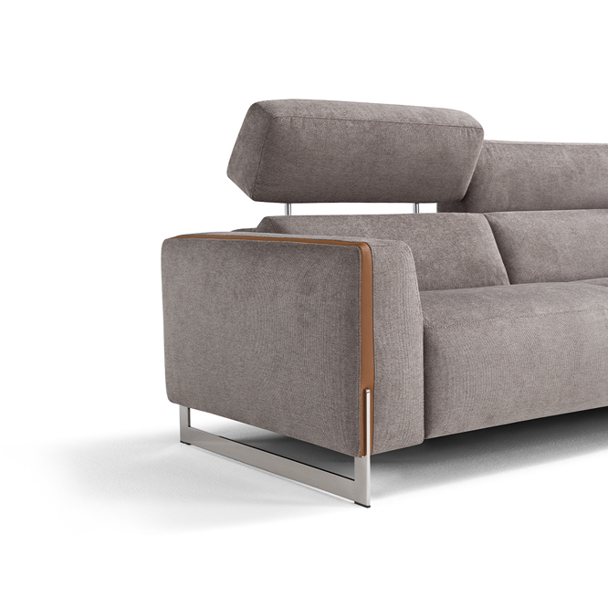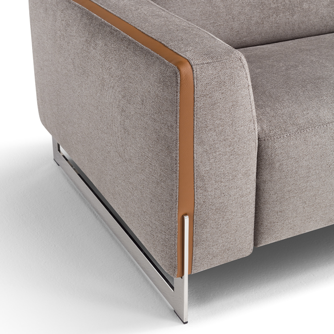 Designed as a perfect solution for the living area, the Arona modular model, presented in the two- or three-seater version, is the ideal compromise between comfort and aesthetics. With solid and compact volumes, this sofa is characterized by the fine decorative elements in the armrests consisting of a contrasting leather band integrated with the metal sled on which the entire structure rests. Equipped with electrically operated recliner mechanisms for both the footrest and headrest of each chair, Arona ensures maximum comfort in few simple gestures. Characterized by the perimeter band finish of the cushions, also available with contrast stitching, it can be further customized by choosing between a leather or fabric covering.