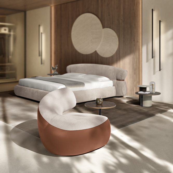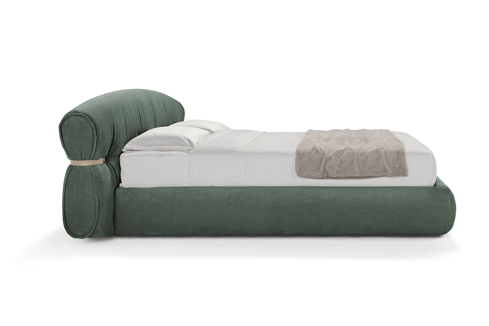 Soft, comfortable and inviting to take a rest: the Bon Bon bed is characterized by a design in which corners are banished in favour of soft, welcoming lines. It features a tailored detail of a contrast leather strap marked on the side of the headboard, and dynamism, it is entirely upholstered in ecological fabric, soft and with a velvety texture.
