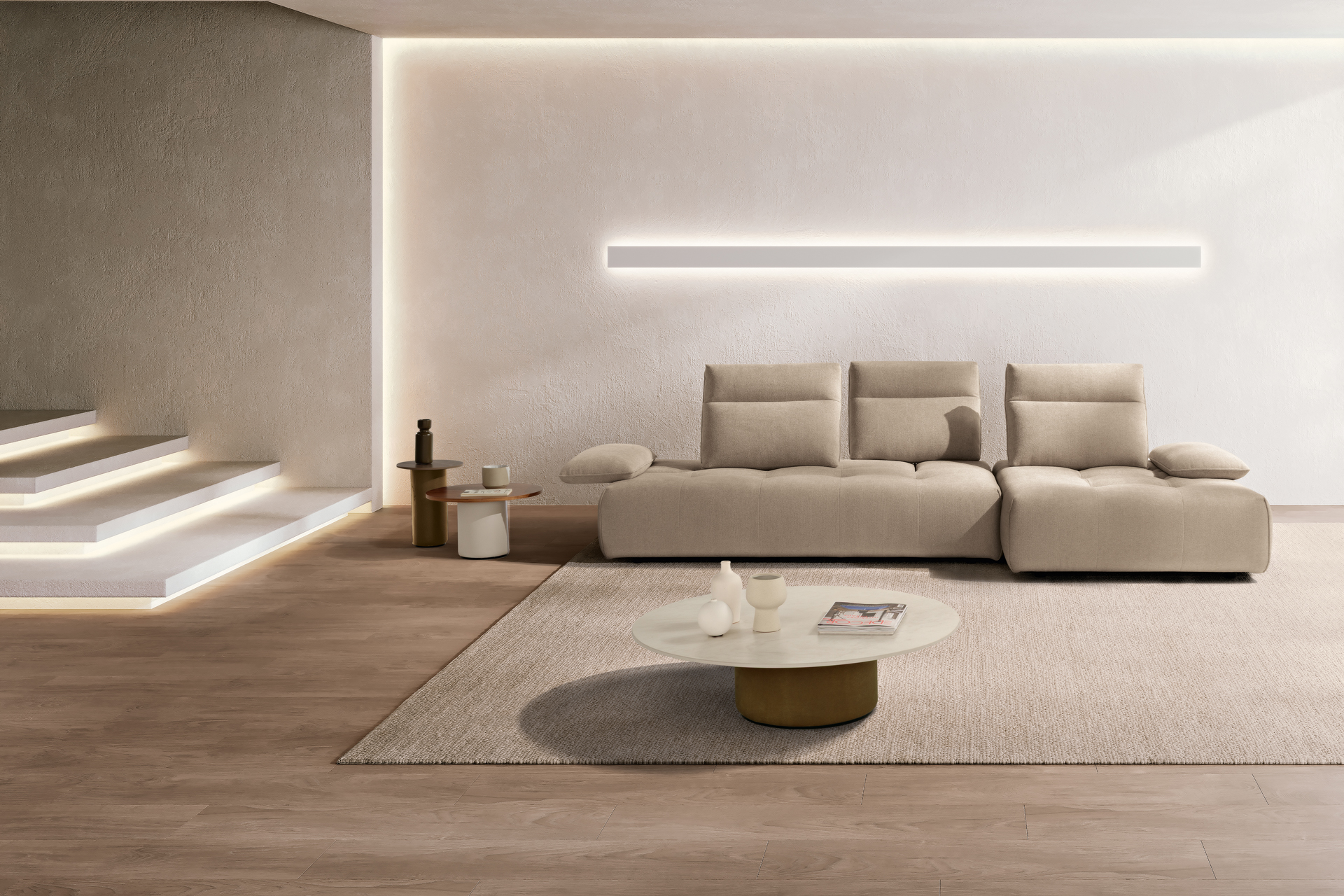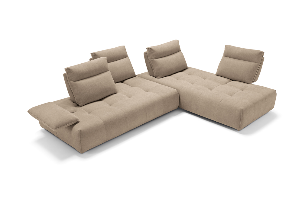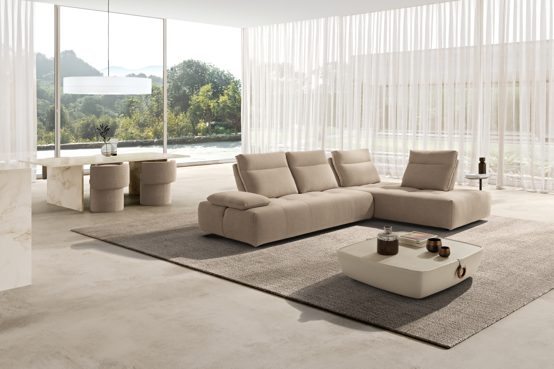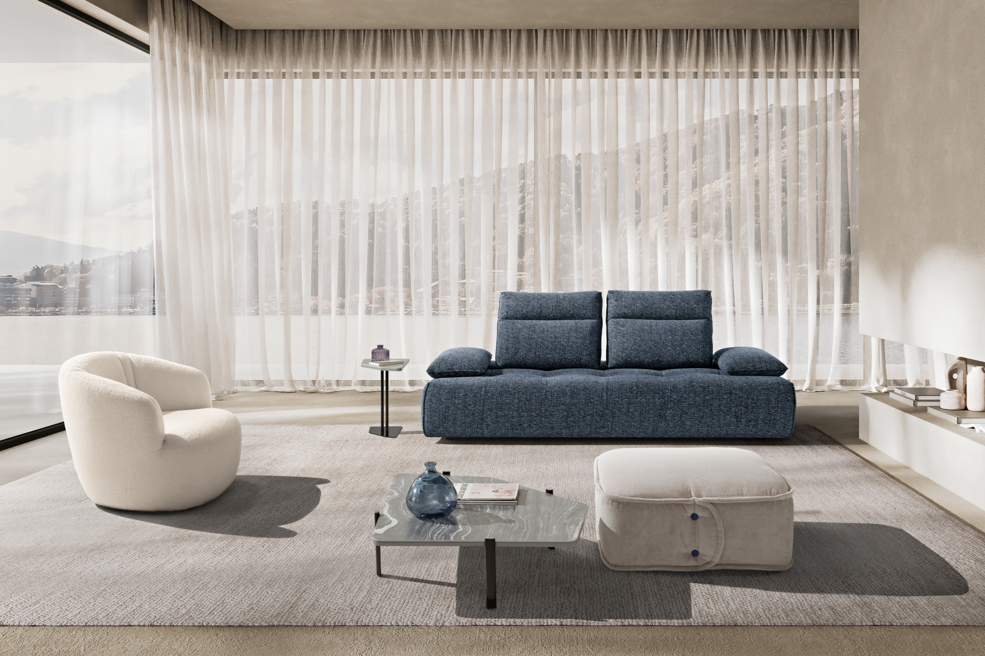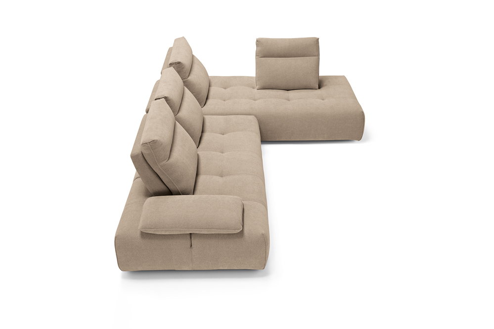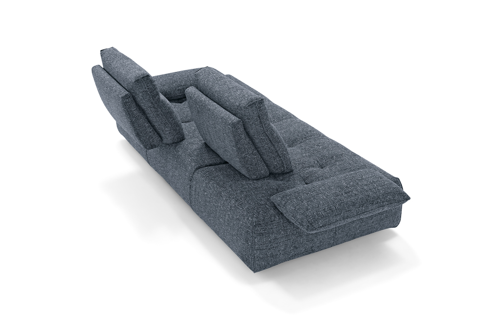 Designed to dynamically accommodate spaces and needs of daily life, the Ella modular sofa, upholstered with removable fabrics, is a model that shows personality, versatility and large variety of combinations. Starting from a single monobloc module, this sofa can in fact be declined into unlimited configurations, simply by juxtaposing further rectangular modules – chaise longue or terminal peninsulas – and square poufs. Both armrests and backrests move horizontally: this movement allows the depth of the seat to vary, resulting in a sofa that is constantly evolving and never the same. The sartorial care of Maxdivani creations is finally expressed in the quilted workmanship of the seat and in the horizontal stitching shown on the backrest, defining a comfortable headrest.