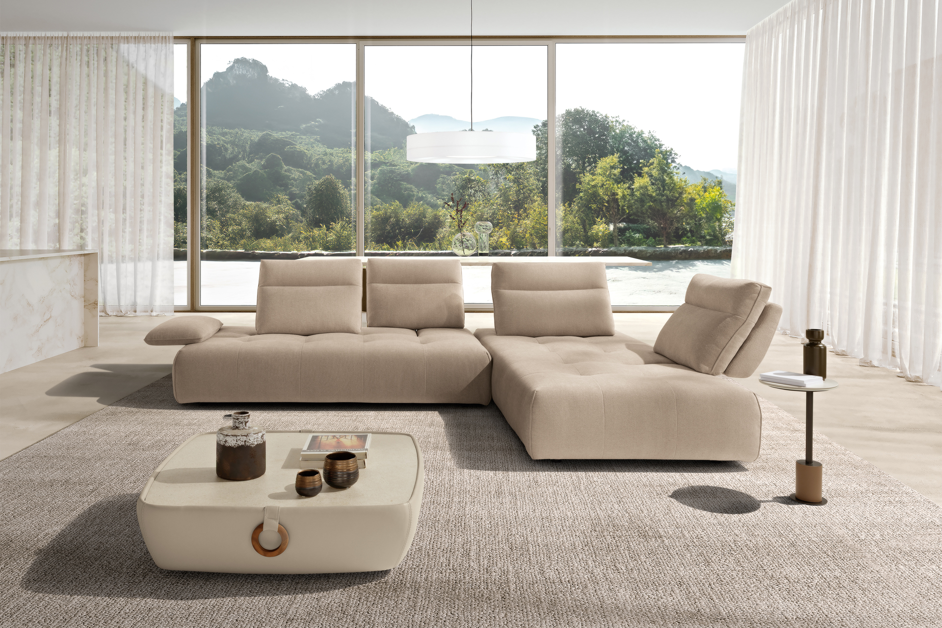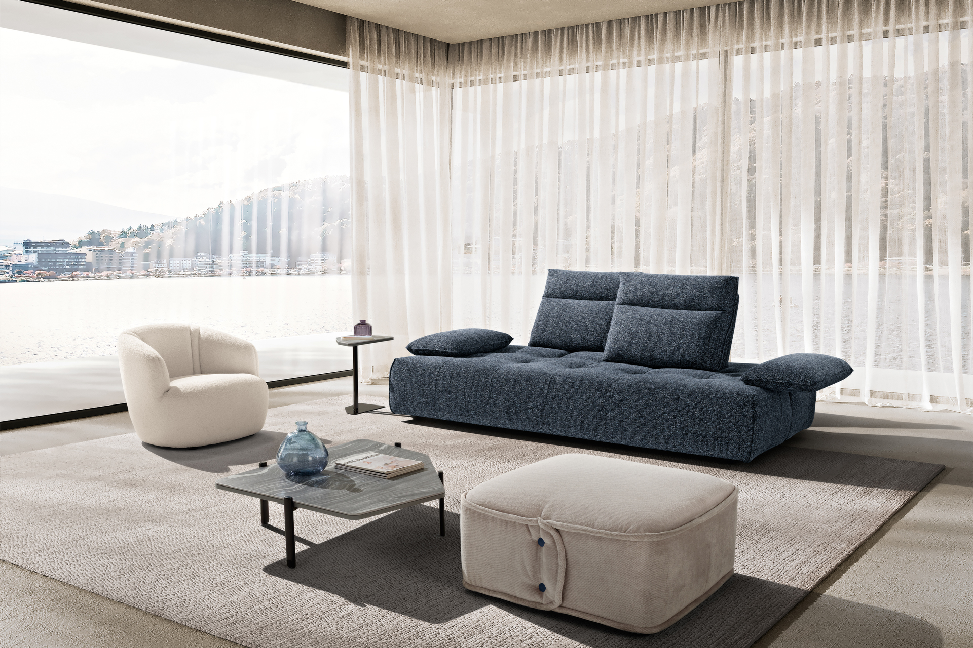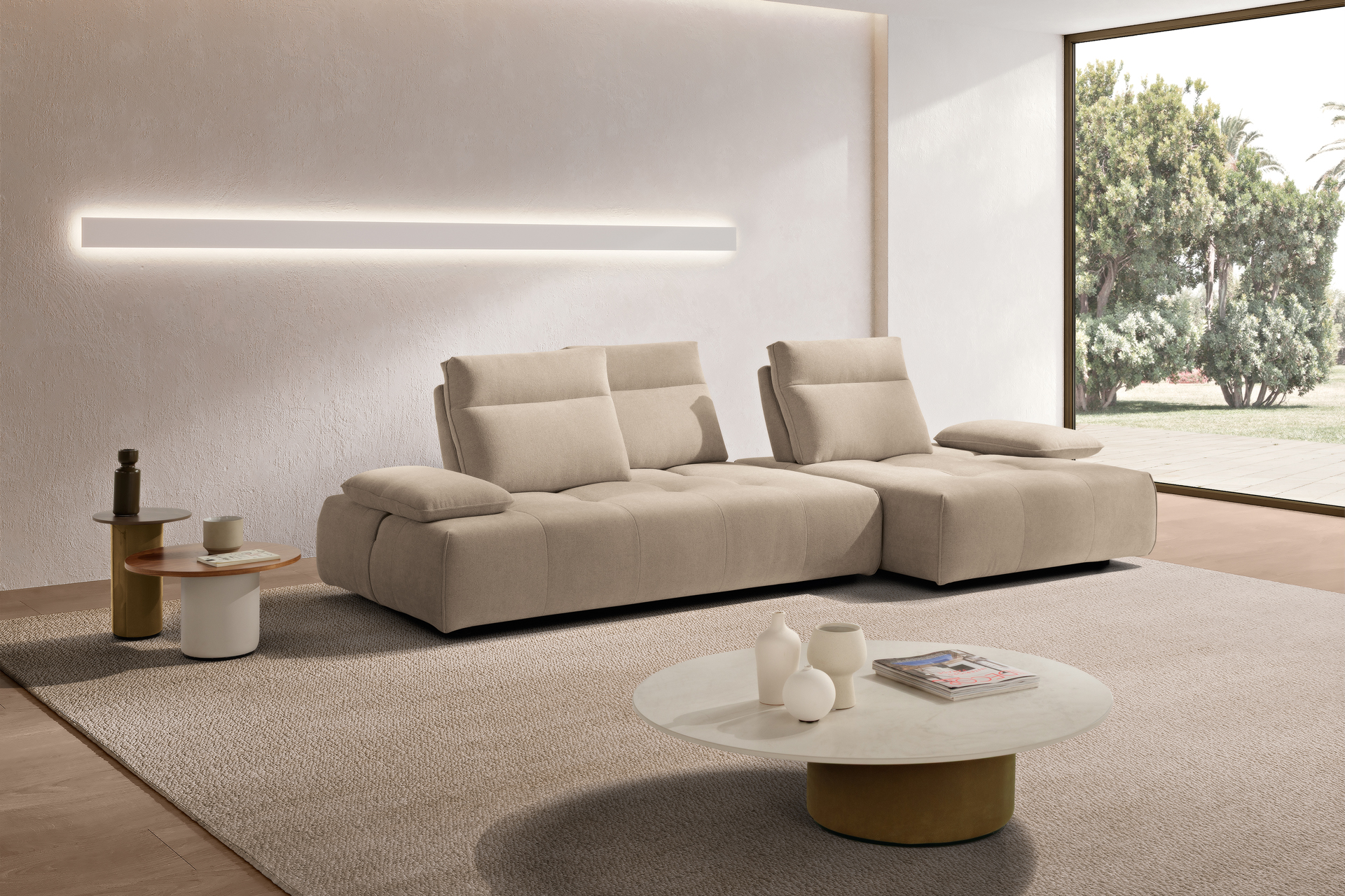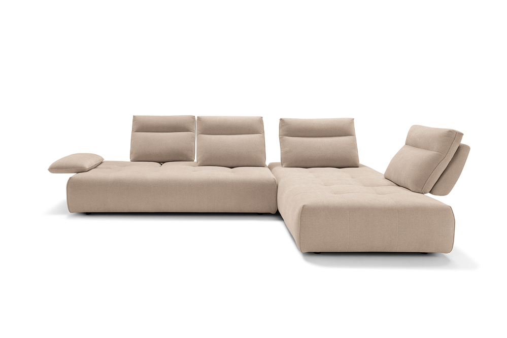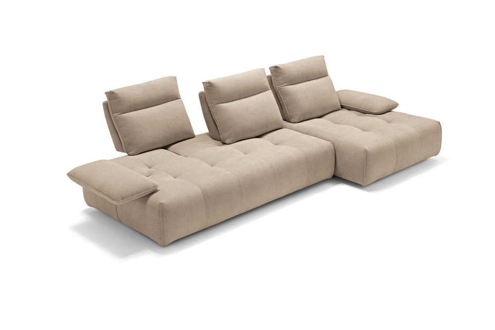 Designed to dynamically accommodate spaces and needs of daily life, the Ella modular sofa, upholstered with removable fabrics, is a model that shows personality, versatility and large variety of combinations. Starting from a single monobloc module, this sofa can in fact be declined into unlimited configurations, simply by juxtaposing further rectangular modules – chaise longue or terminal peninsulas – and square poufs. Both armrests and backrests move horizontally: this movement allows the depth of the seat to vary, resulting in a sofa that is constantly evolving and never the same. The sartorial care of Maxdivani creations is finally expressed in the quilted workmanship of the seat and in the horizontal stitching shown on the backrest, defining a comfortable headrest.