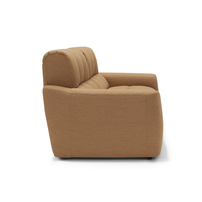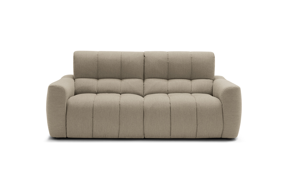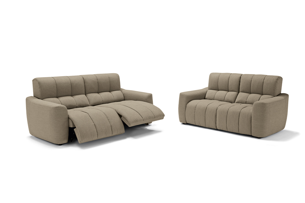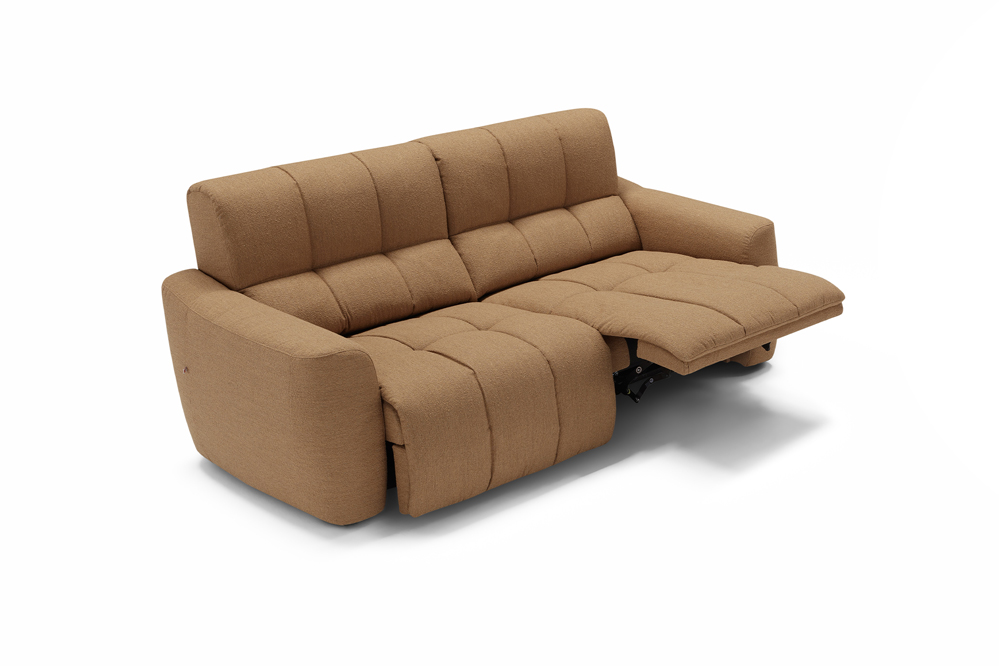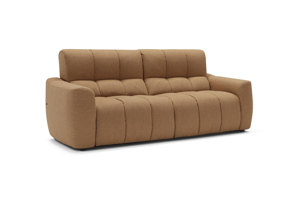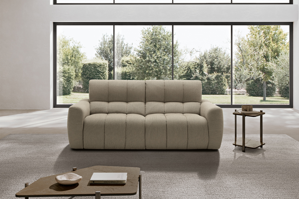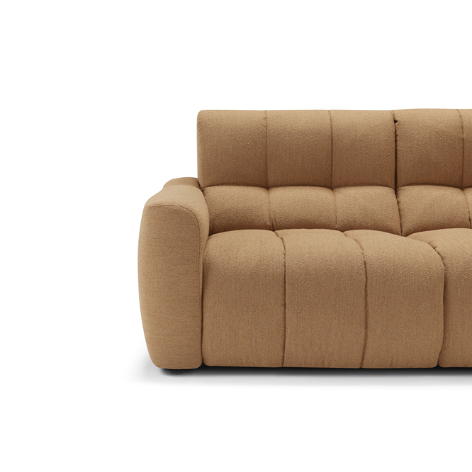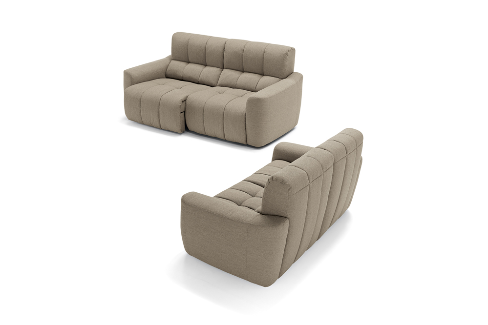 The Macario modular sofa is the perfect solution for those who desire a flexible cosy space where relaxation is the absolute star. Available in a three-seater and two-seater solution, this model can be combined with a chaise longue or extended to obtain a corner by connecting modules. Distinguished by its soft and cosy shapes, enhanced by the quilted stitching with a banded pattern and the soft upholstery in bouclé-effect fabric, Macario is equipped with a double relaxation movement that can be activated by means of an electric push-button panel: the seat thus slides into chaise longue mode while the footboard lifts into the recliner position. The seat also features padding with pocket springs: these provide the sofa with ergonomic support and durability, helping to maintain its shape.
