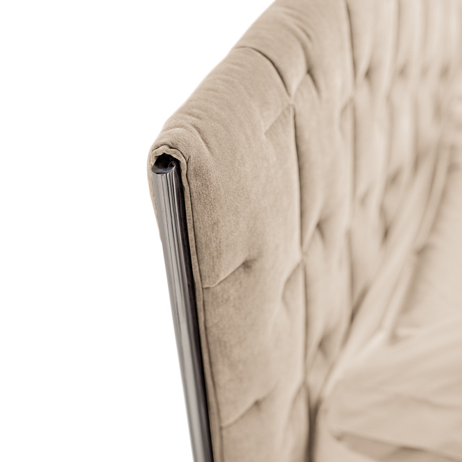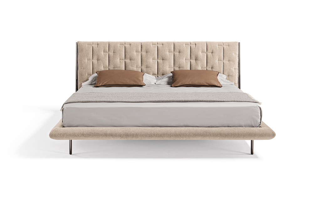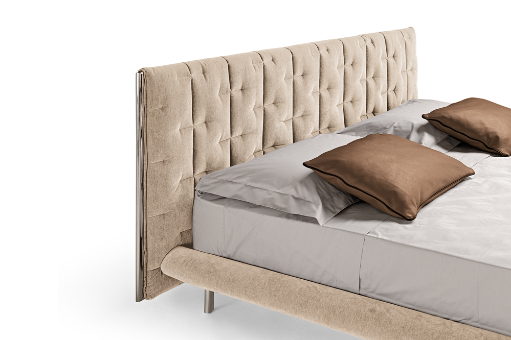 Functionality meets aesthetic elegance in the Muzzle double bed. The extra-large headboard, with a metal profile, is upholstered in stylish leather, featuring an exclusive quilted pattern that creates an elegant three-dimensional play of light and shadows. This model rests on a solid wooden structure with a signature padded surround upholstered in the same leather.