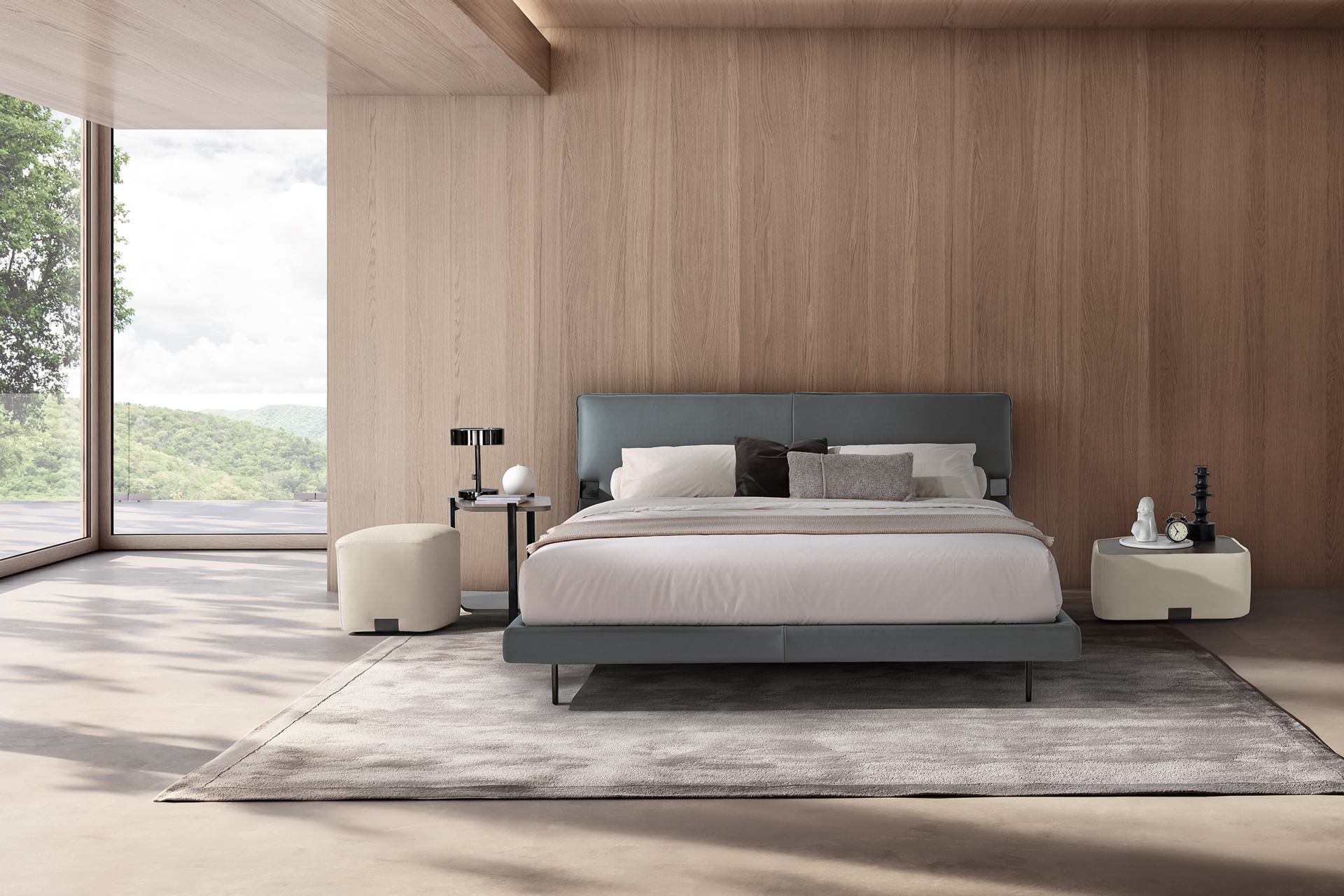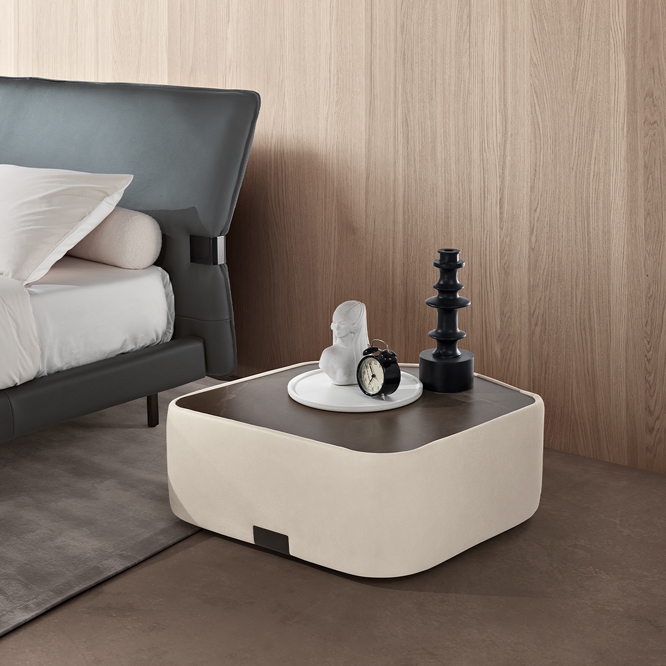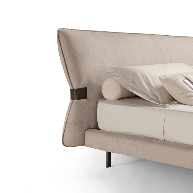 With simple but far from predictable lines, Nel is a double bed that combines proportions, design and comfort. The leather headboard, with gathered stitching, features a signature decorative metal “clip” that creates a slight angle and adds a sense of movement to the structure. The bed rests on a solid padded base upholstered in the same leather as the headboard, creating a sense of stability and durability.