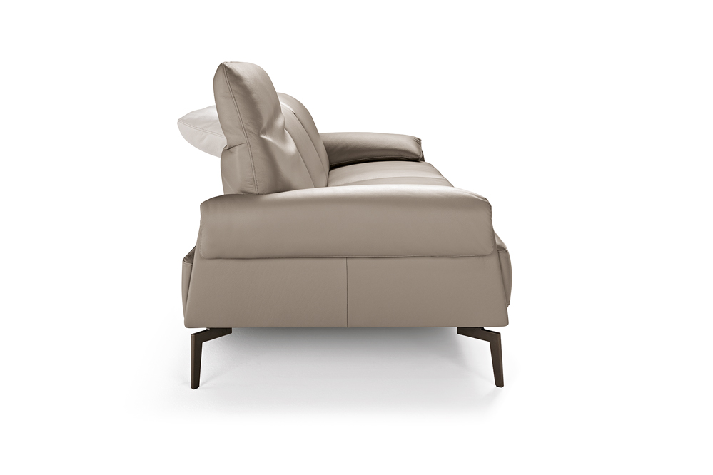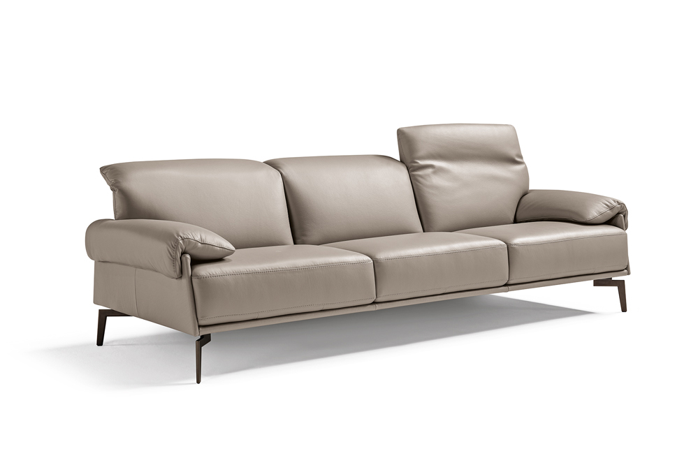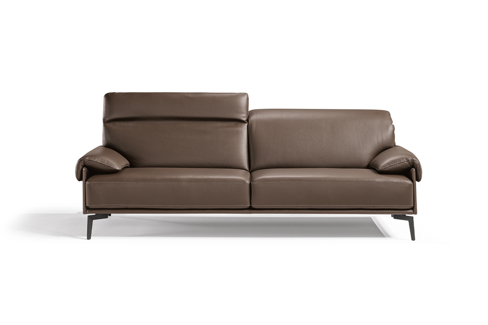 The uniqueness of the Norma model is represented by the seat cushion visible from all sides, a very wide and high cushion that replaces the side, emphasized by a horizontal leather base that turns vertically as part of the armrest. The side is characterized by a sloping panel that leaves the seat cushion free to view, partially revealing the back, so the sofa can be easily placed in the middle of the room. The very soft cape armrest recalls the design and comfort of the headrests – reclining in multiple positions.