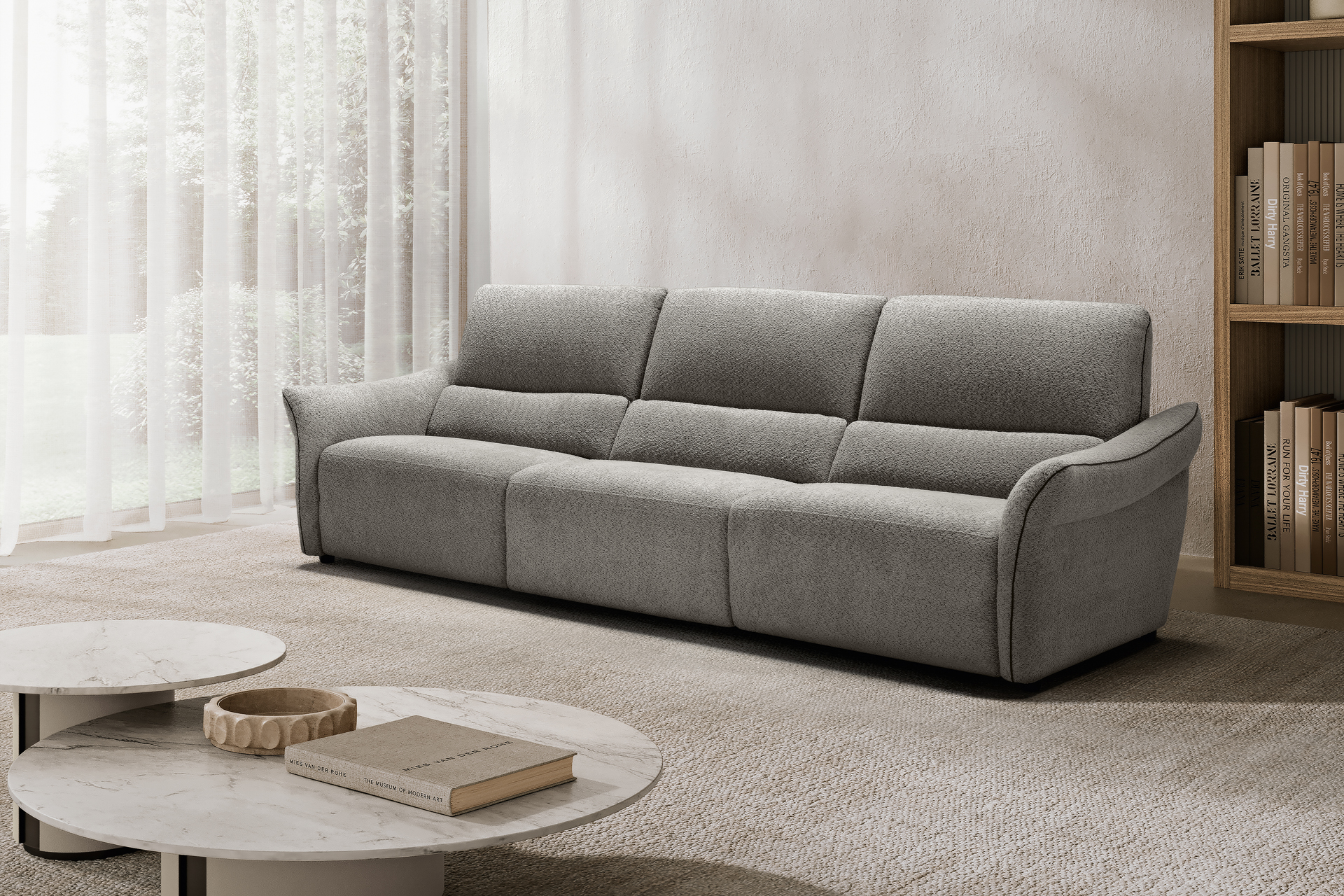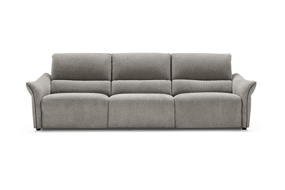 The ideal solution for add a touch of style to the living room, the Pierre model is a spacious modular sofa – the perfect combination of comfort and design. This model has a solid, compact appearance and includes double automatic mechanisms for each armchair that can operate the footrest or backrest with a single press of a button. Upholstered in statement bouclé-effect fabric and finished with piping in a contrasting colour, this model is available with different densities of padding for a customised comfort experience.