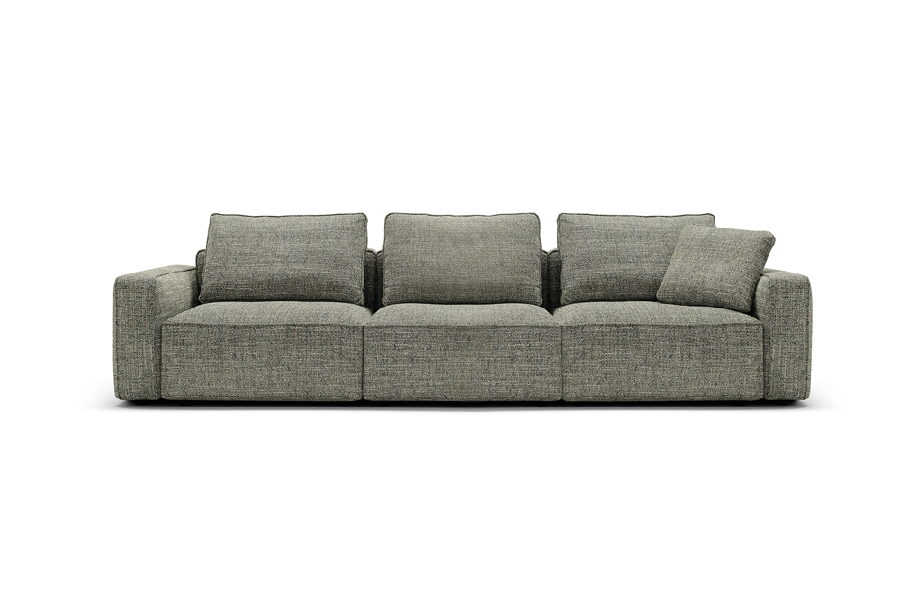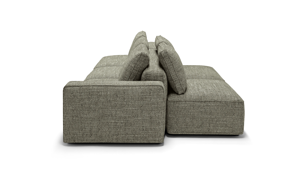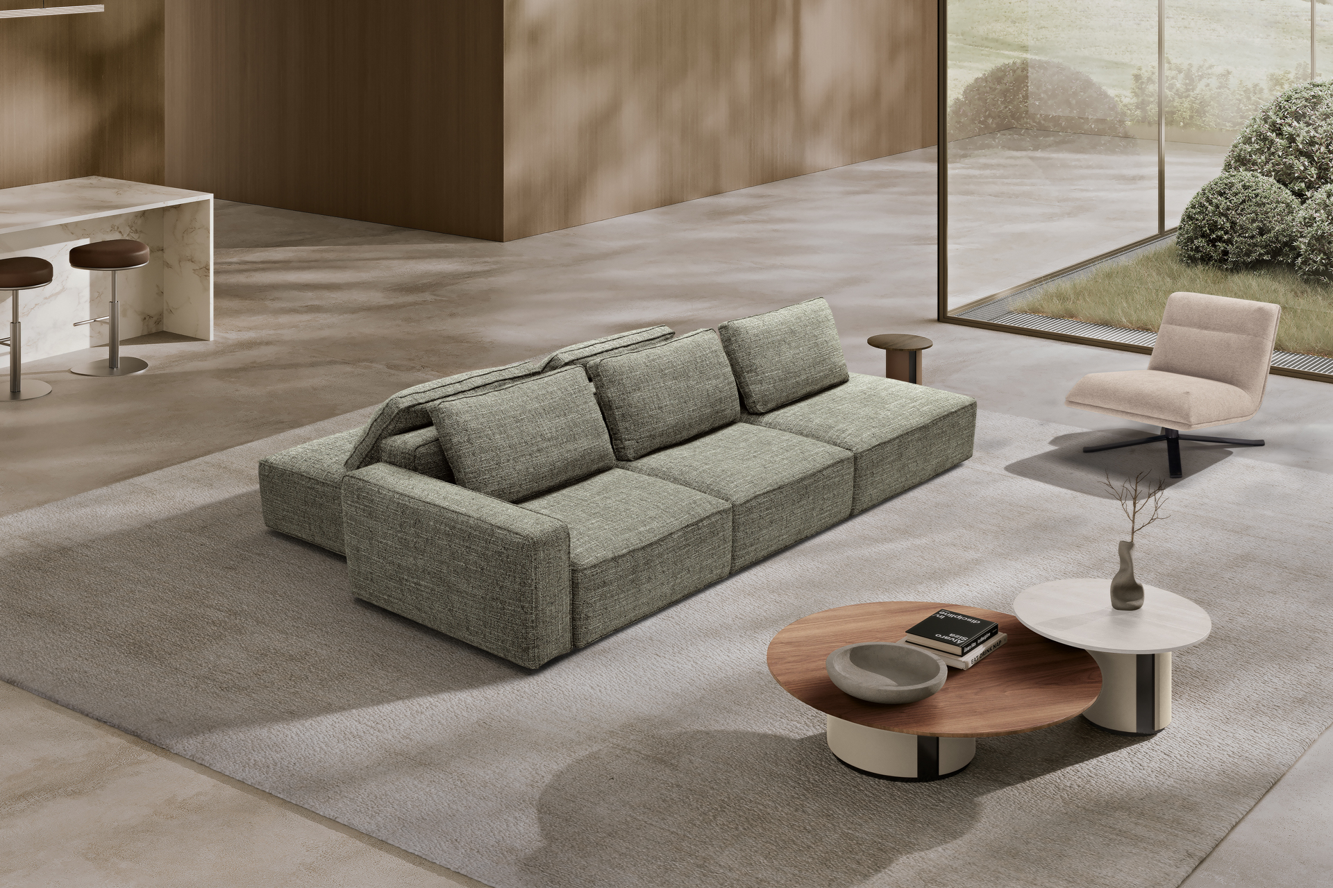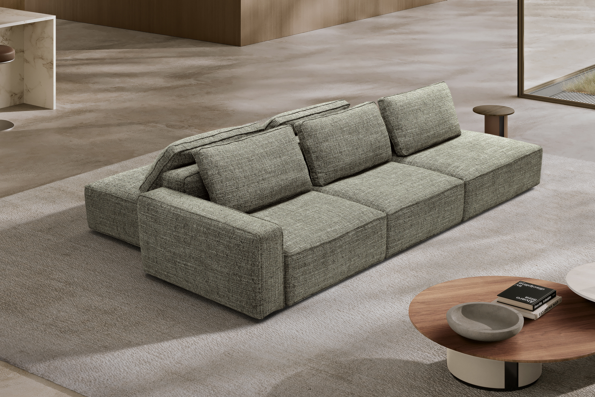 Starring a leading role in the living area, the Raja four-seater modular sofa lends itself dynamically to a wide range of configurations, ready to satisfy all the activities of a daily life. Perfect to be placed in an open space in its double-sided version, it is a model that stands out for its defined and rigorous volumes, counter balanced by the soft removable backrests upholstered in fine goose feather. Available with removable fabric or upholstered leather, Raja can be further embellished with the insertion of a pouf with a Canaletto walnut shelf.