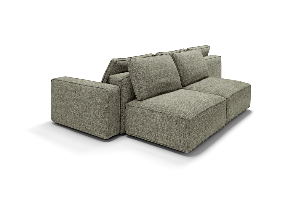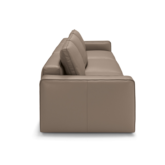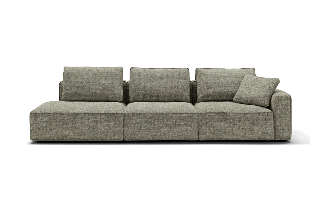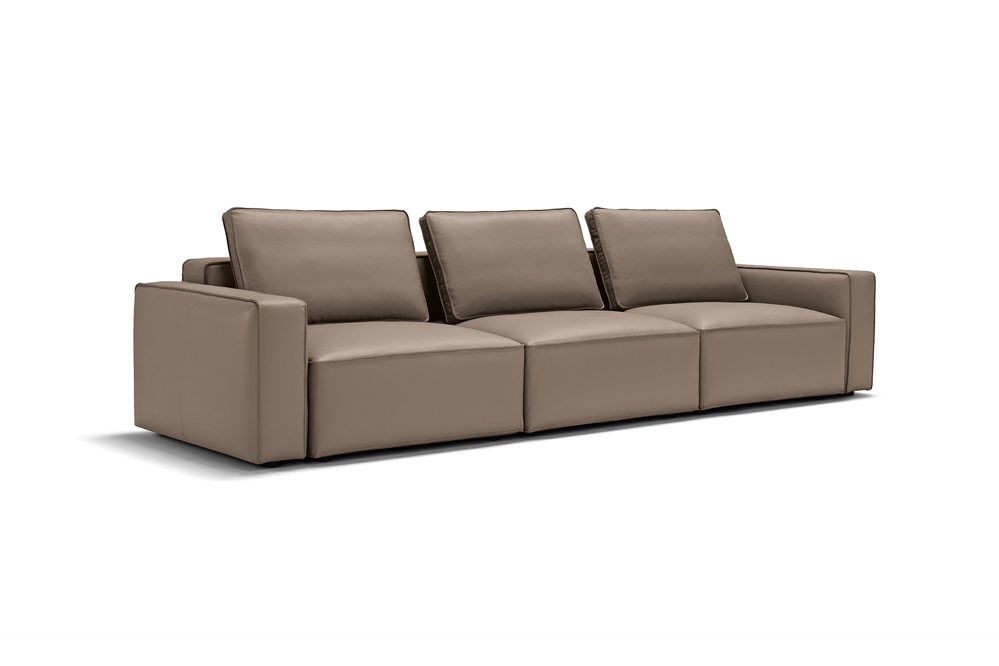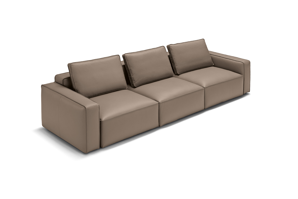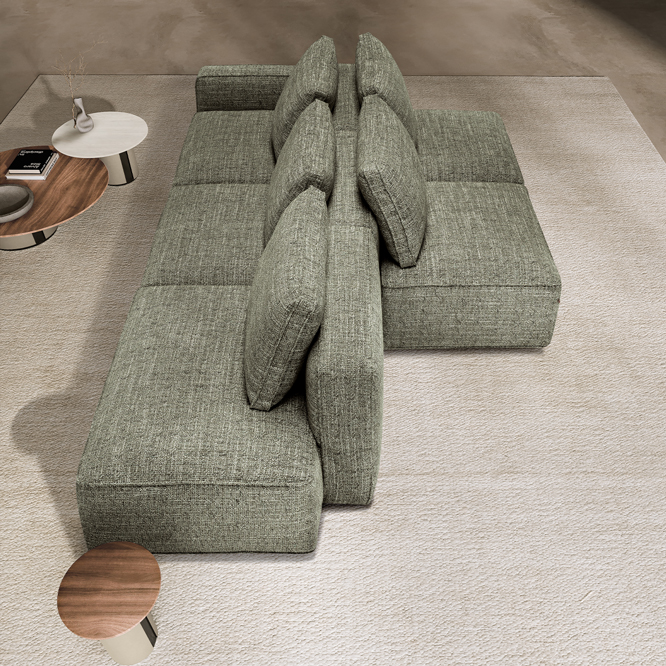 Starring a leading role in the living area, the Raja four-seater modular sofa lends itself dynamically to a wide range of configurations, ready to satisfy all the activities of a daily life. Perfect to be placed in an open space in its double-sided version, it is a model that stands out for its defined and rigorous volumes, counter balanced by the soft removable backrests upholstered in fine goose feather. Available with removable fabric or upholstered leather, Raja can be further embellished with the insertion of a pouf with a Canaletto walnut shelf.