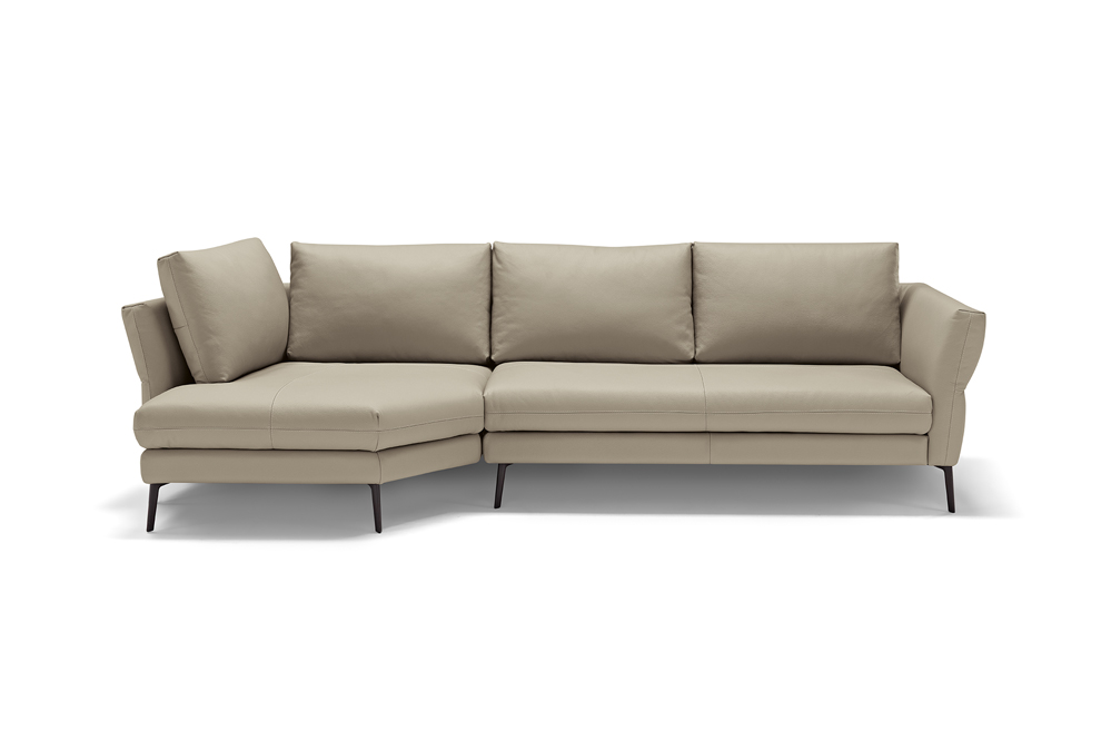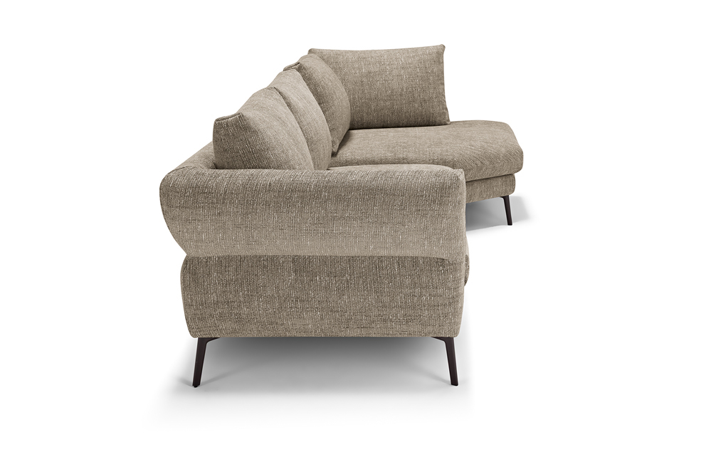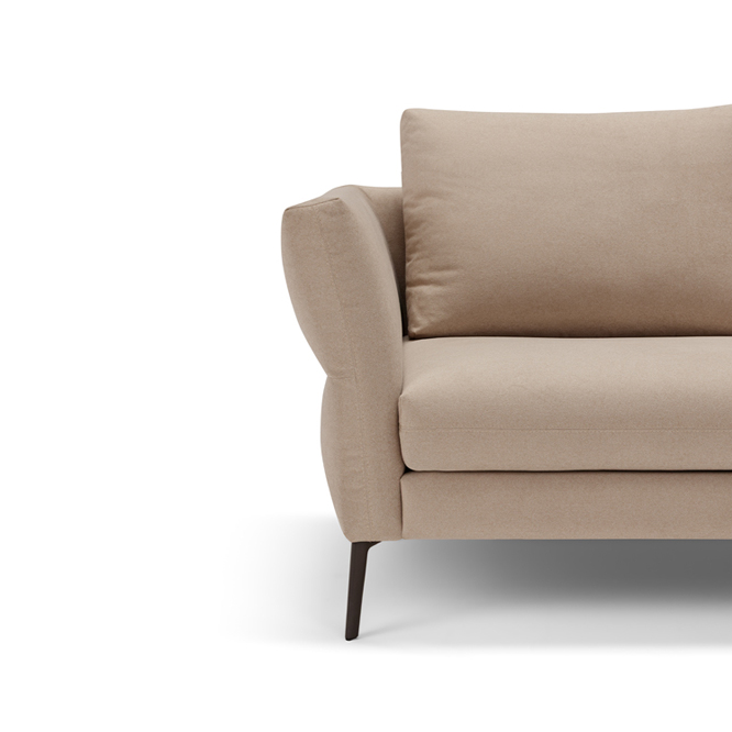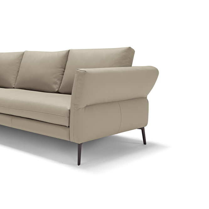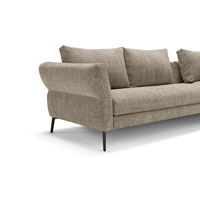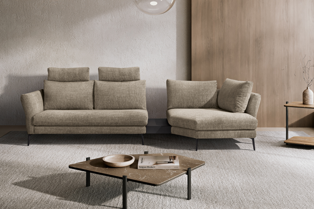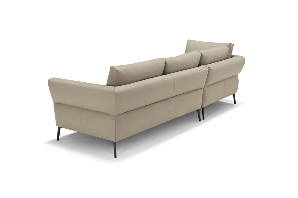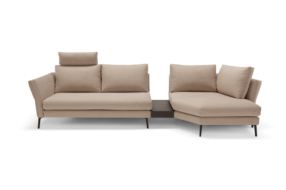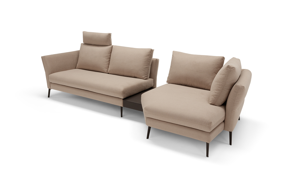 Designed to furnish the living area with versatility, Vibe is a large three-seat sofa to which we have combined a peninsula with a trapezoidal base and backrests. These last define two additional seats, thus multiplying the comfort and use of this model. Particularly refined in design and suitable as a room centrepiece, Vibe is characterised by its backrest, on which a continuous stitching draws two overlapping horizontal bands. The upper one, thanks to a skilful play of padding, defines a slightly projecting profile. For additional comfort and functionality, it is possible to add headrests to the back cushions and to insert as a connecting element between the individual modules a useful small table with metal shelf, available in two different finishings.
