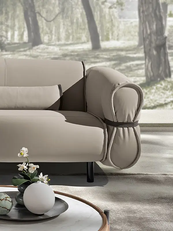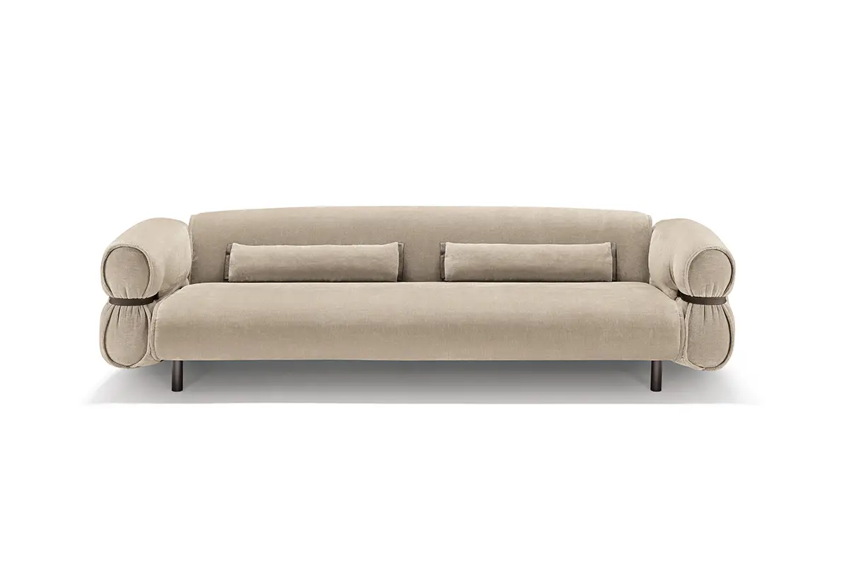 Bon Bon è una presenza che caratterizza gli ambienti con personalità e leggerezza. Il design, elegante e al tempo stesso informale, evoca la forma di una caramella arrotolata, con il particolare estetico di lacci in pelle abbottonati ai lati che stringono i braccioli, esaltando l’unicità della lavorazione artigianale.