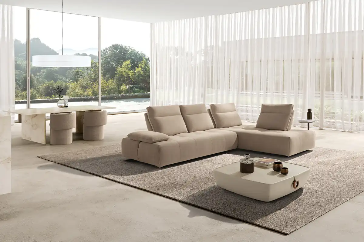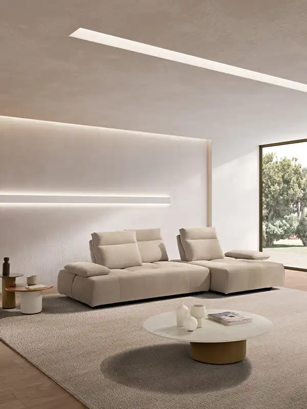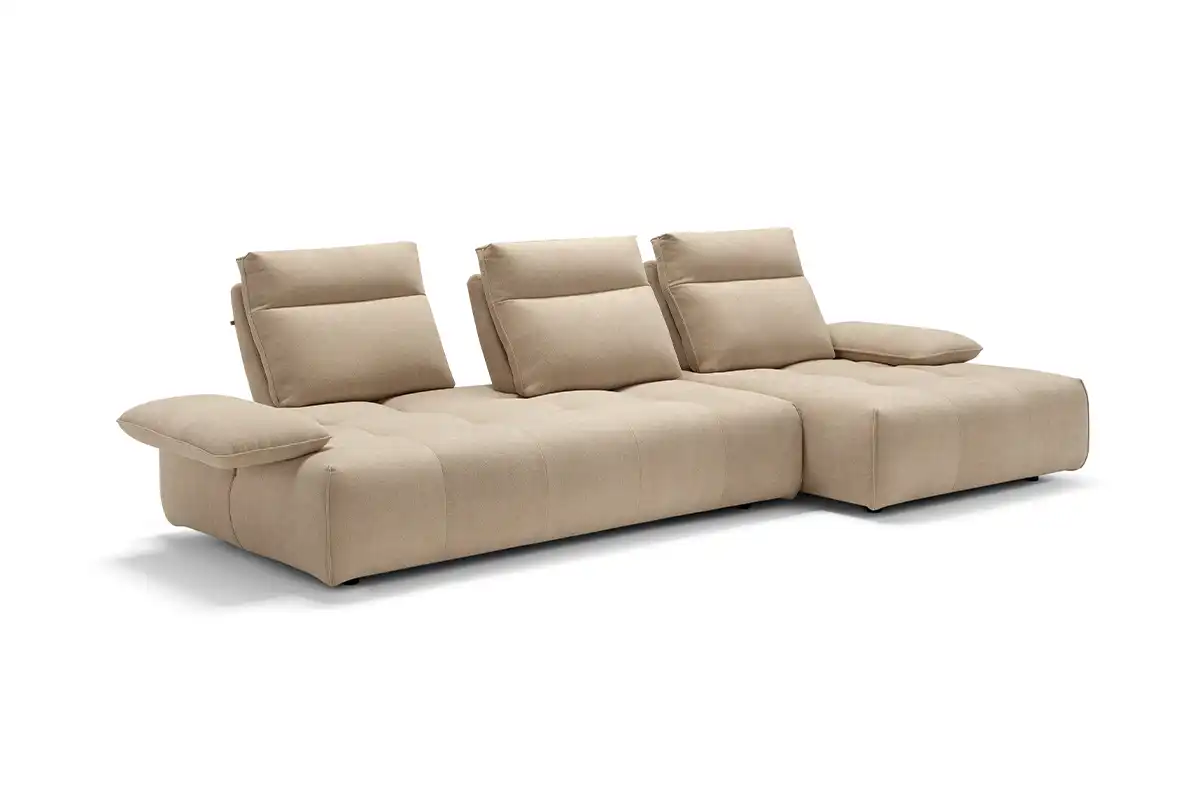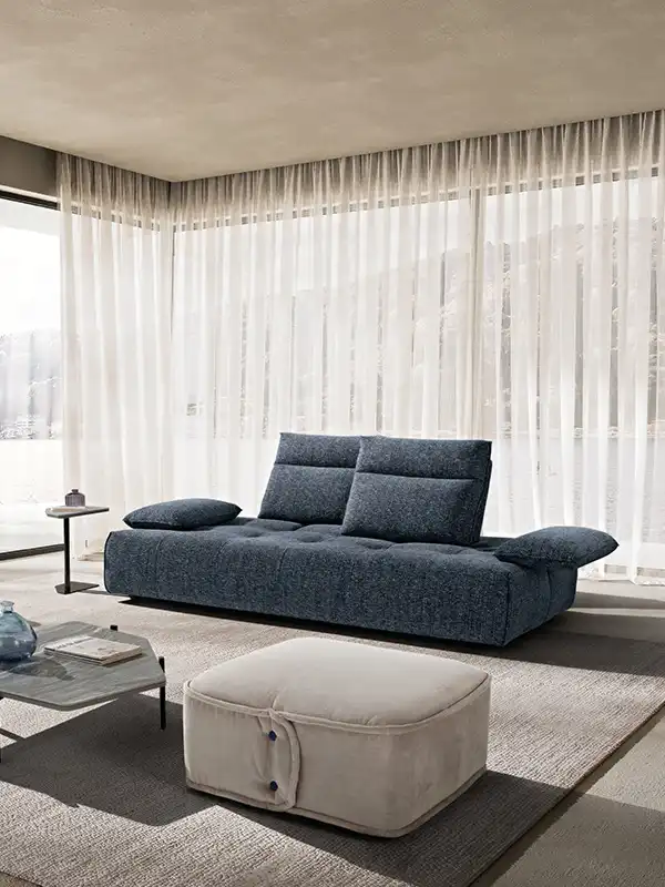 Ideato per assecondare con dinamismo gli spazi e le esigenze della vita contemporanea, il divano modulare Ella, rivestito in tessuto completamente sfoderabile, è un modello che esprime personalità, versatilità e massima libertà compositiva. Partendo da un singolo modulo monoblocco, questo divano può essere infatti declinato in illimitate configurazioni, semplicemente giustapponendo ulteriori moduli rettangolari – chaise longue o penisole terminali – e pouf quadrati. Traslanti orizzontalmente sono sia i braccioli che le spalliere: questo movimento consente di variare la profondità della seduta e di avere un divano in continua evoluzione e mai uguale. La cura sartoriale delle creazioni Maxdivani si esprime infine nella lavorazione trapuntata della seduta e nella cucitura orizzontale presente sullo schienale, a definire un comodo poggiatesta nella parte superiore.