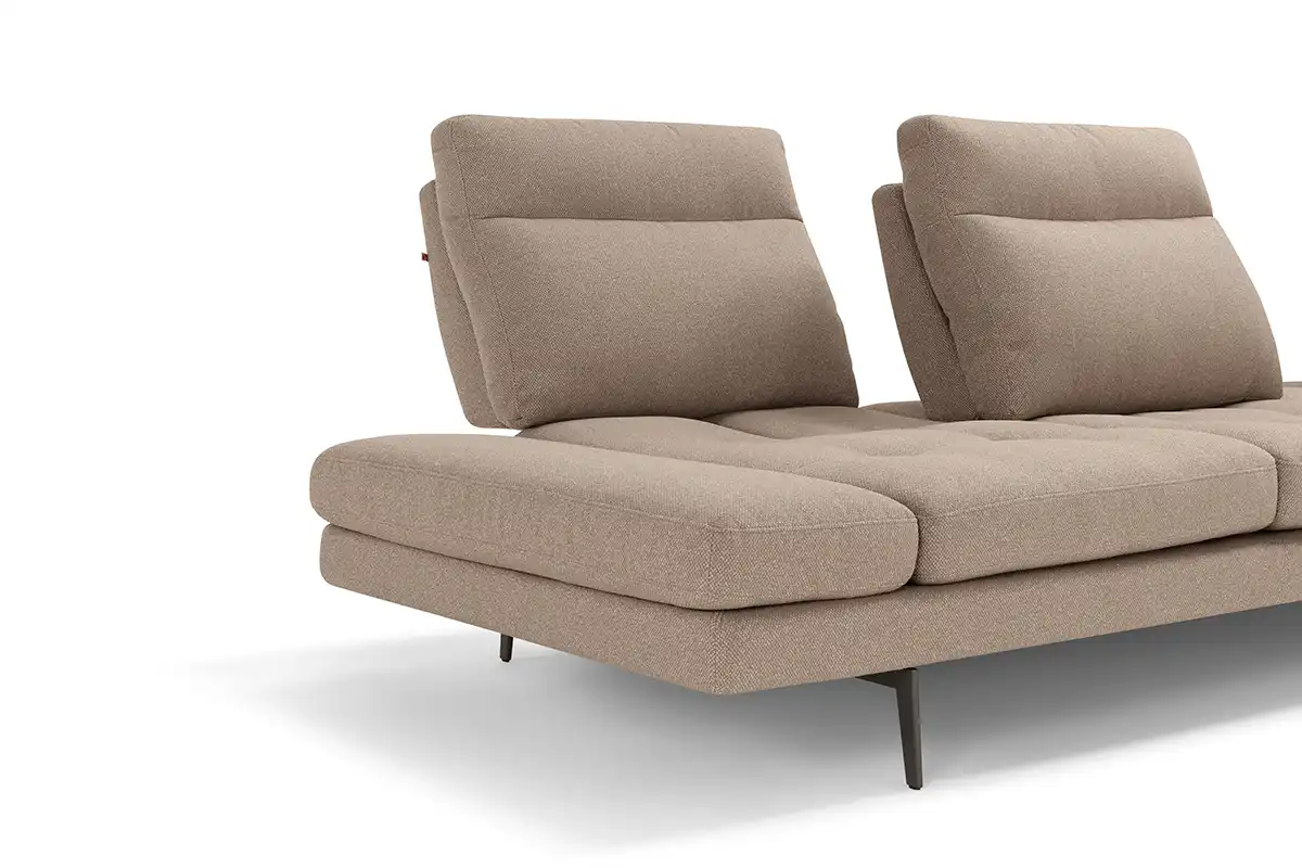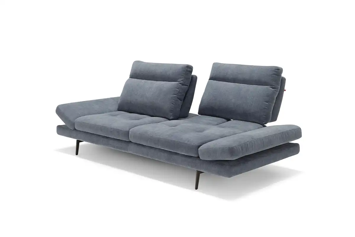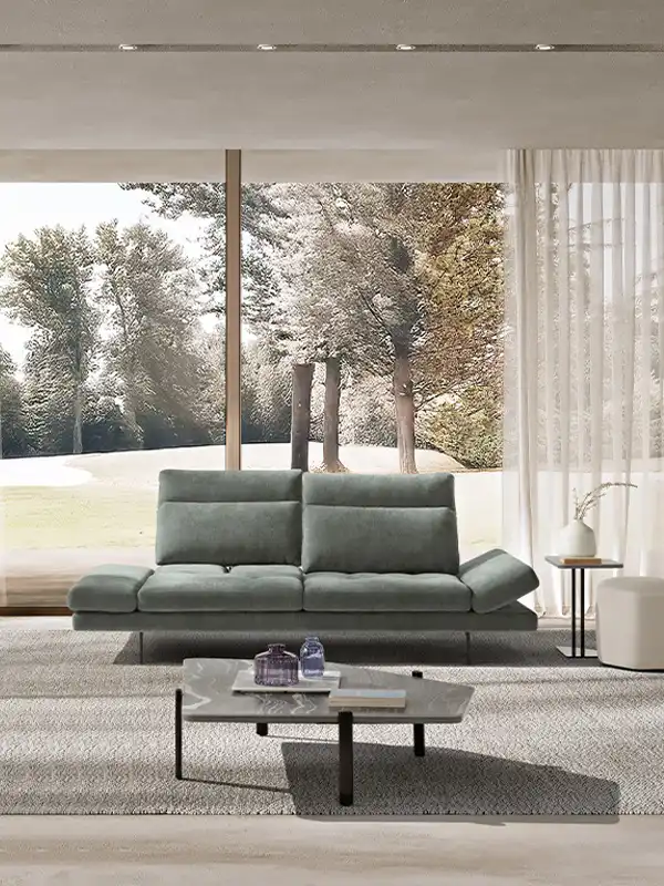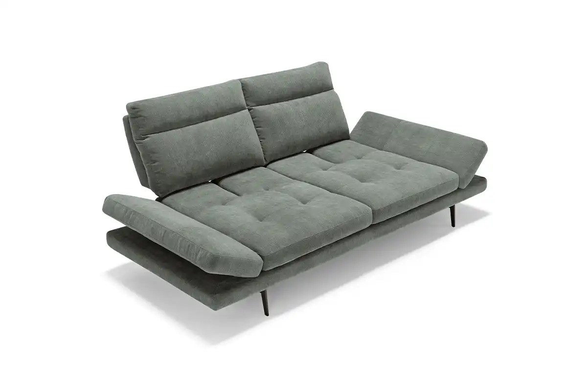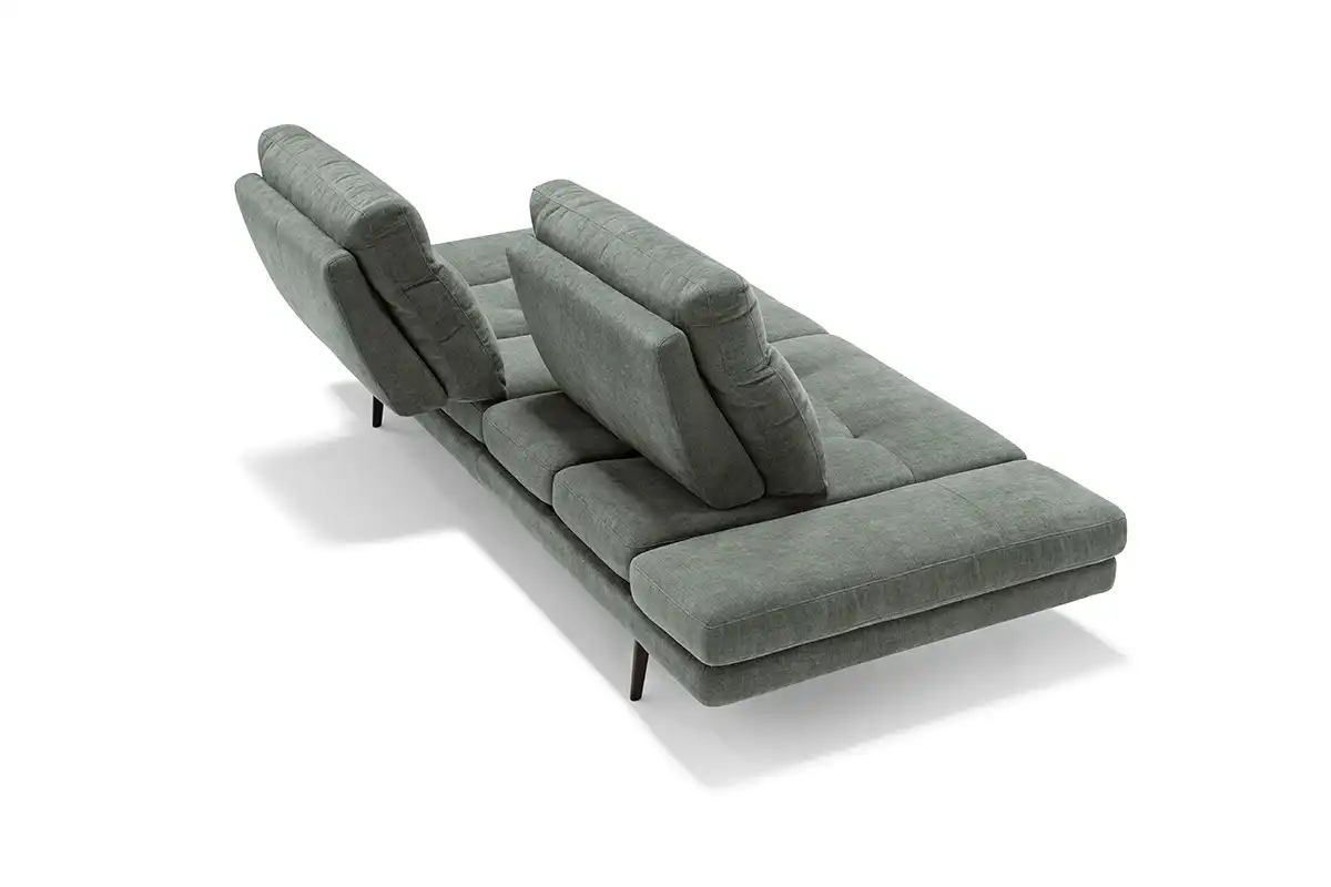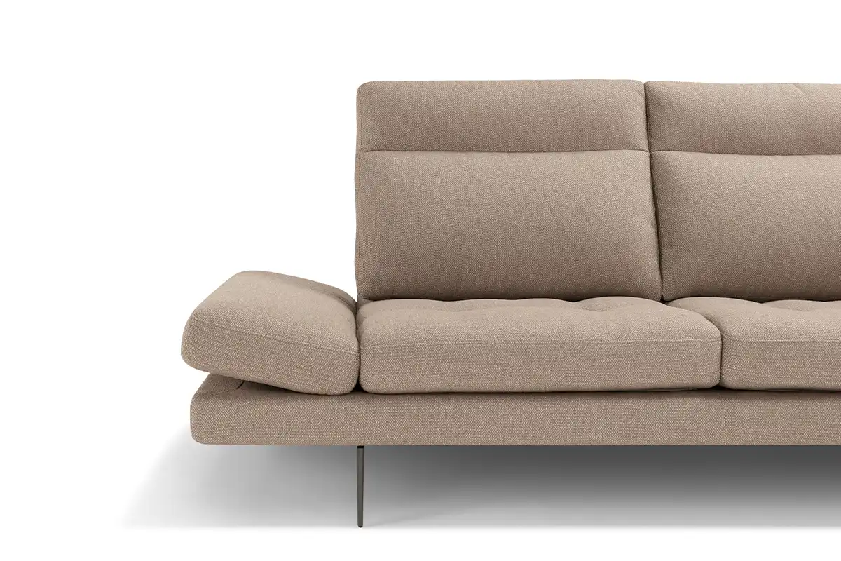Il design essenziale e leggero consente al divano tre posti Enea di essere armonizzabile con qualsiasi stile di arredo, mentre la vasta possibilità di composizioni lo rende compatibile con ogni tipo di spazio, dall’open living ad ambienti più ridotti. Disponibile con rivestimento parzialmente sfoderabile in tessuto o in pelle, questo modello, può essere infatti declinato in molteplici soluzioni, prevedendo ad esempio l’inserimento di una chaise longue, di un pouf terminale o di un modulo di raccordo per ottenere una composizione angolare. Le alte e comode spalliere traslanti permettono di aumentare la profondità di seduta, mentre il bracciolo reclinabile può essere sollevato o tenuto in posizione orizzontale, conferendo così respiro e ariosità all’intera composizione. Espressione di sartorialità sono infine la lavorazione trapuntata della seduta e le cuciture orizzontali presenti sulle spalliere, che vanno a definire confortevoli poggiatesta nella parte superiore.