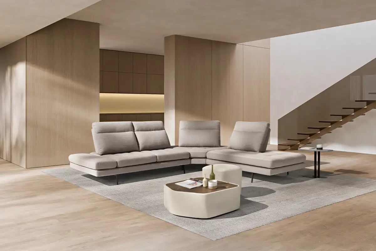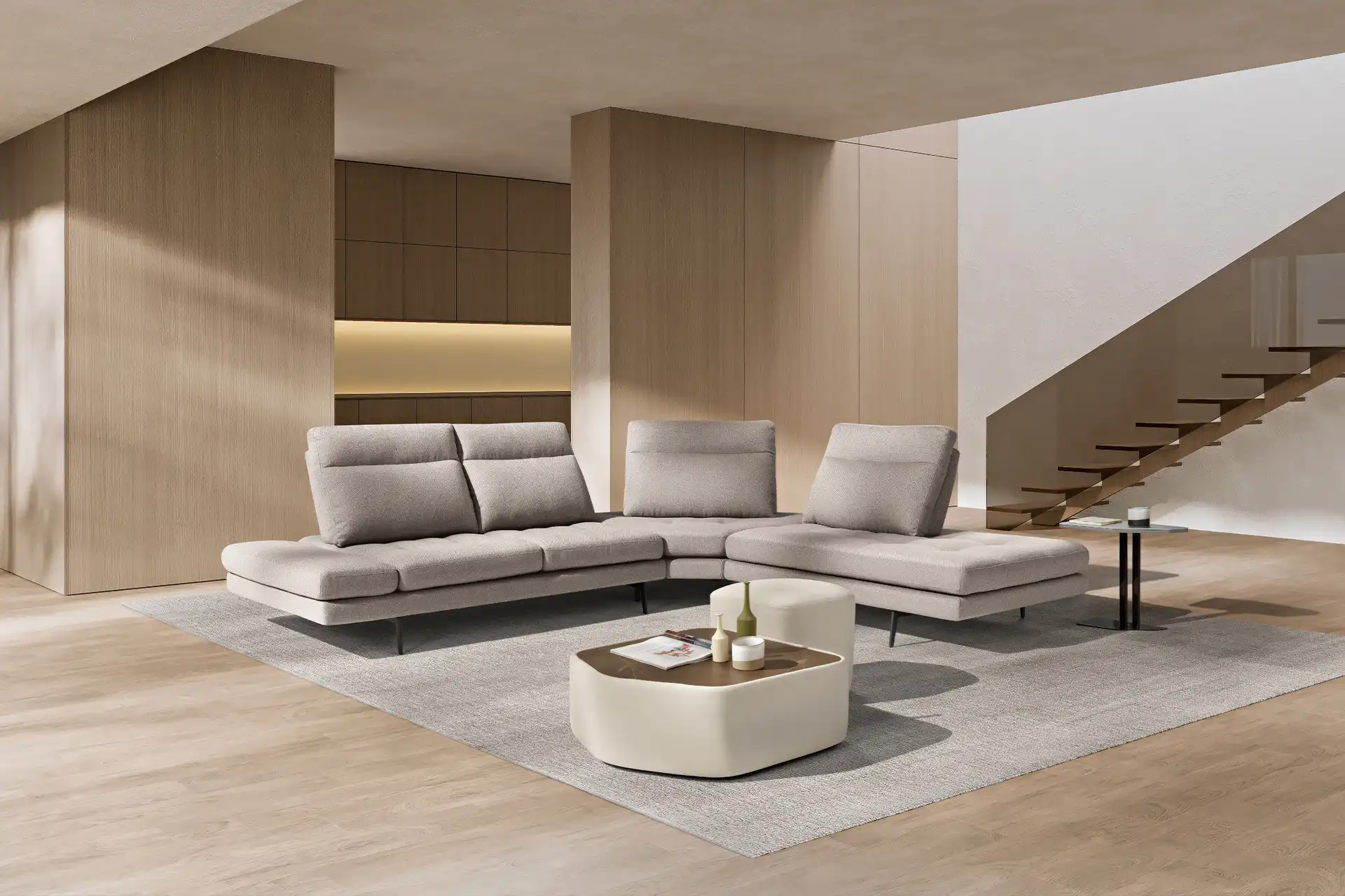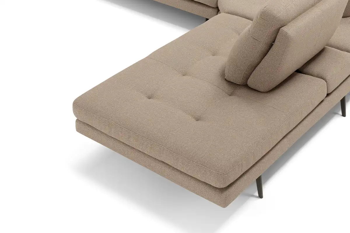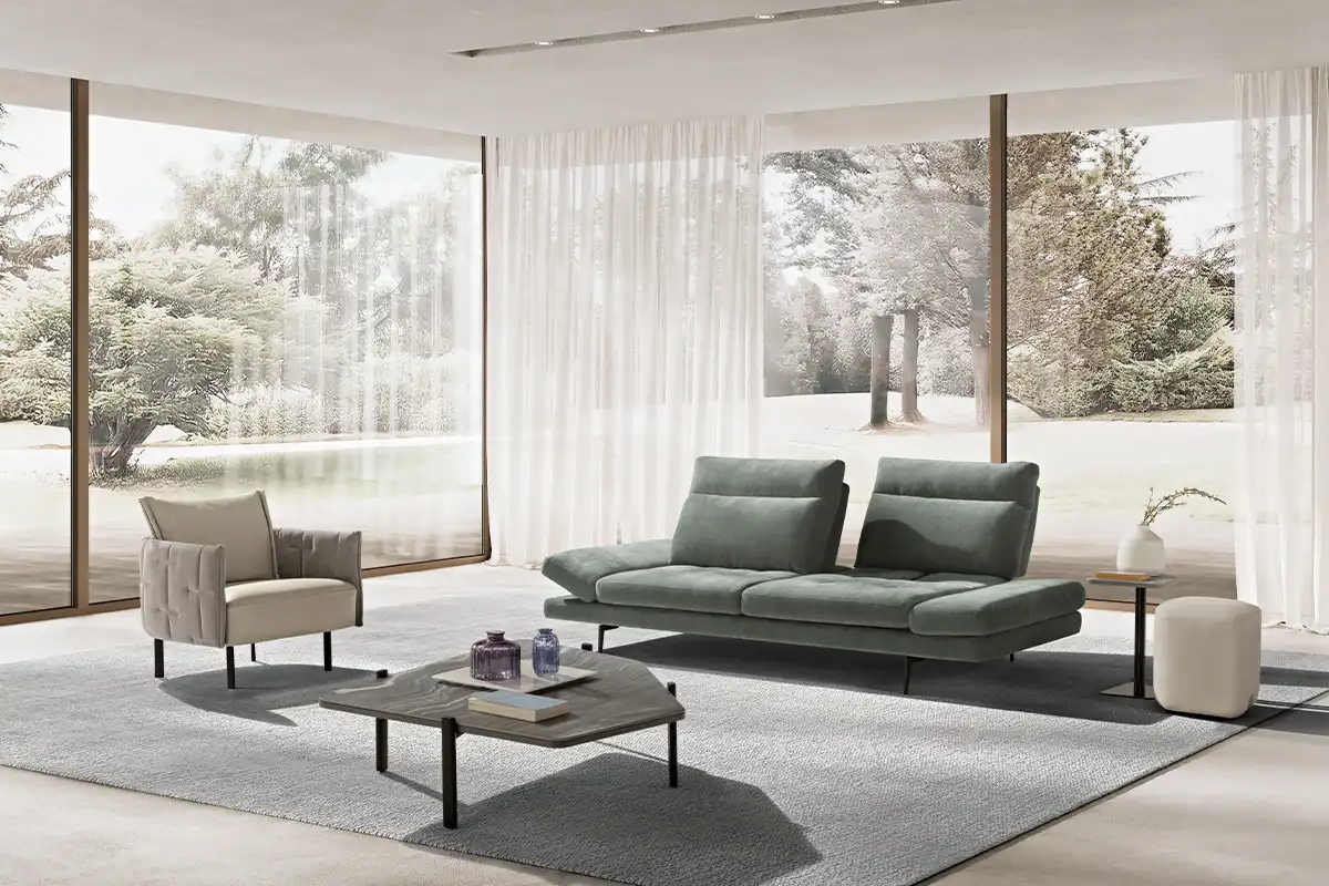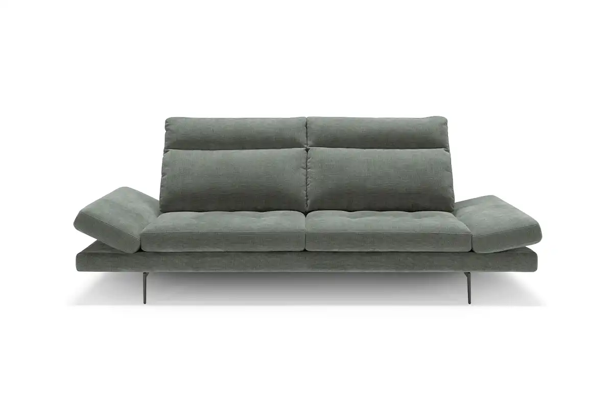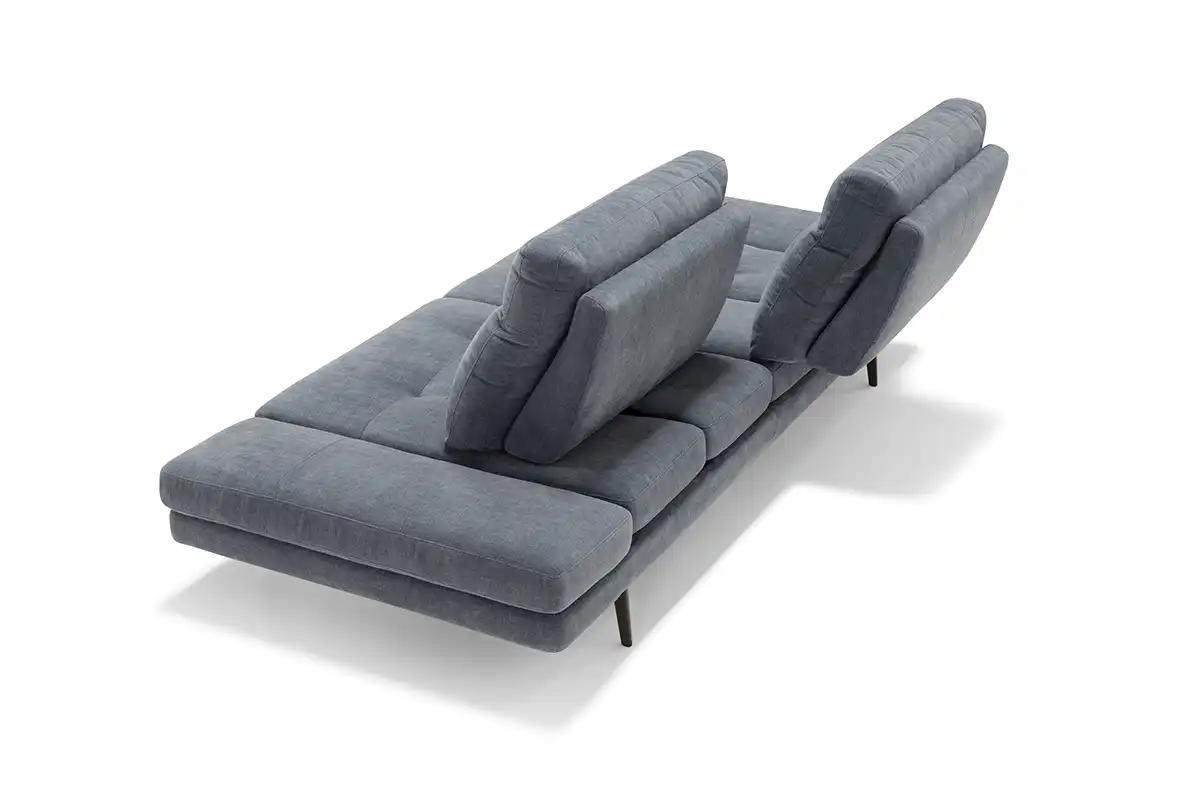 Il design essenziale e leggero consente al divano tre posti Enea di essere armonizzabile con qualsiasi stile di arredo, mentre la vasta possibilità di composizioni lo rende compatibile con ogni tipo di spazio, dall’open living ad ambienti più ridotti. Disponibile con rivestimento parzialmente sfoderabile in tessuto o in pelle, questo modello, può essere infatti declinato in molteplici soluzioni, prevedendo ad esempio l’inserimento di una chaise longue, di un pouf terminale o di un modulo di raccordo per ottenere una composizione angolare. Le alte e comode spalliere traslanti permettono di aumentare la profondità di seduta, mentre il bracciolo reclinabile può essere sollevato o tenuto in posizione orizzontale, conferendo così respiro e ariosità all’intera composizione. Espressione di sartorialità sono infine la lavorazione trapuntata della seduta e le cuciture orizzontali presenti sulle spalliere, che vanno a definire confortevoli poggiatesta nella parte superiore.