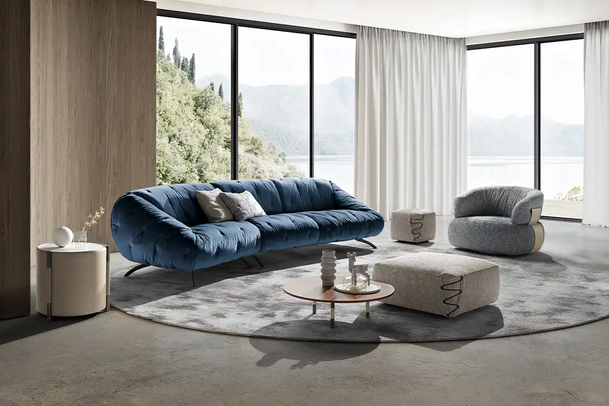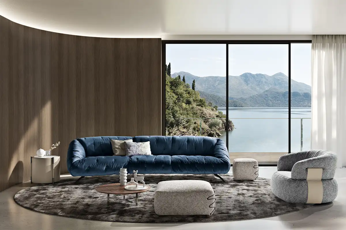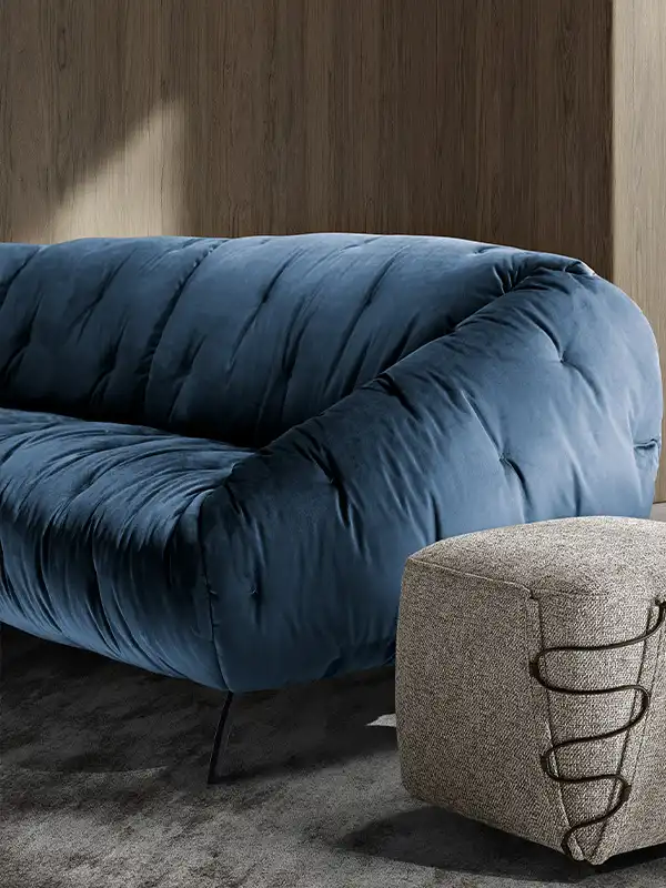 Globo è un sofà caratterizzato da un aspetto informale e dalle linee arrotondate di schienale e braccioli che accentuano morbidezza e dinamicità. La seduta è soffice e profonda. La raffinata trapuntatura del rivestimento è visibile a 360° su tutta la superficie e lo rende perfetto da ammirare al centro della stanza.