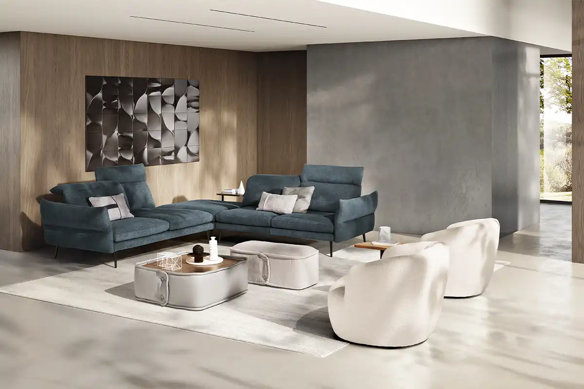 Espressione di versatilità e dinamismo, il divano Modula, è il risultato di una sapiente combinazione di versioni. Il modello si sviluppa linearmente in una armonia di differenti profondità.