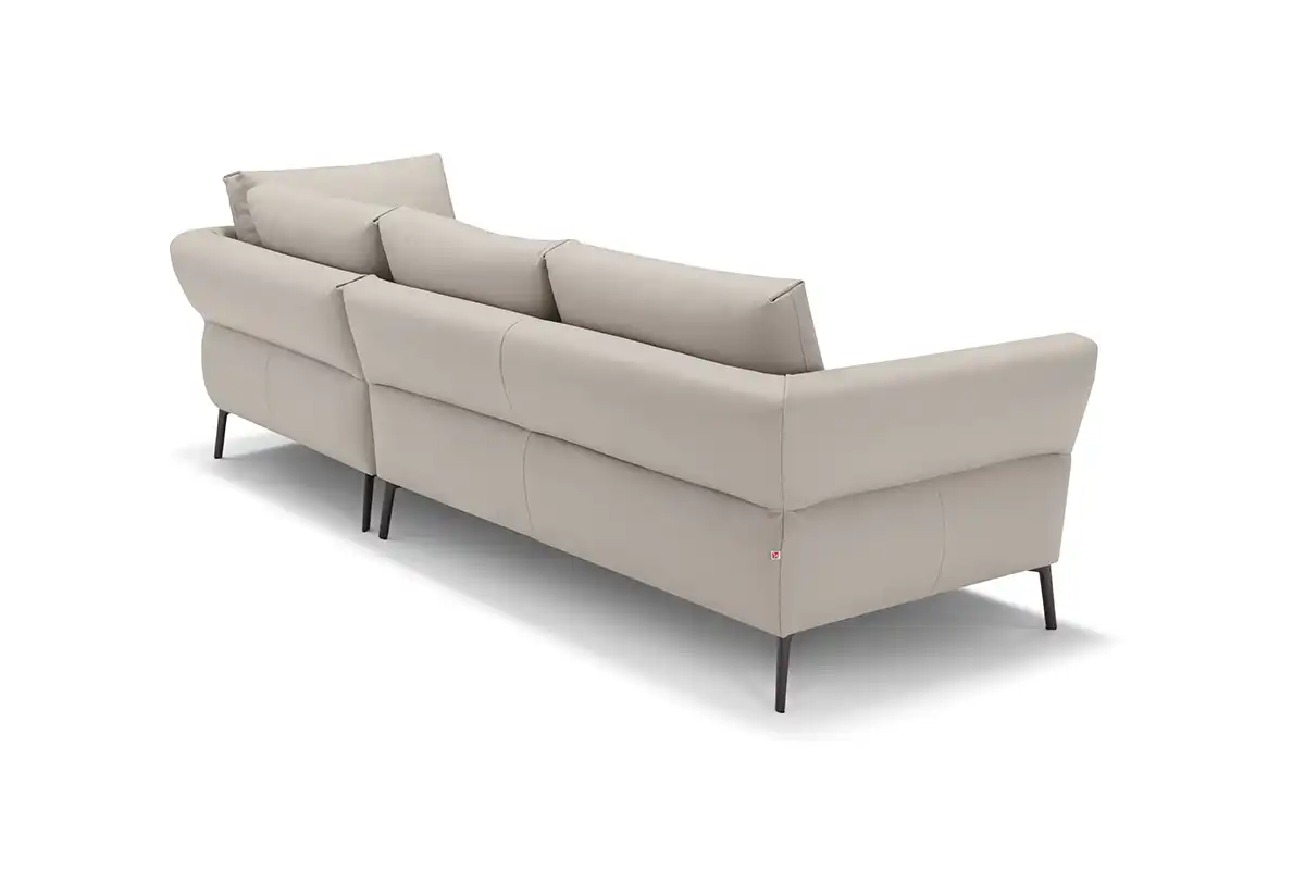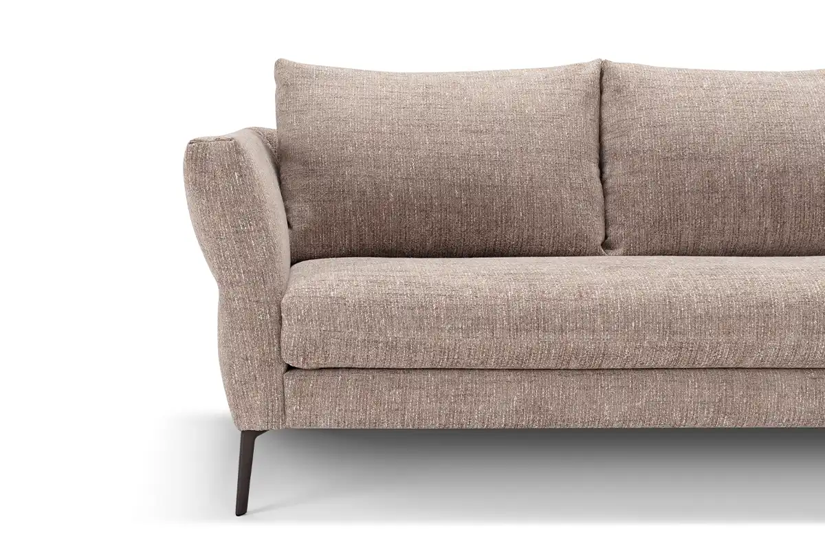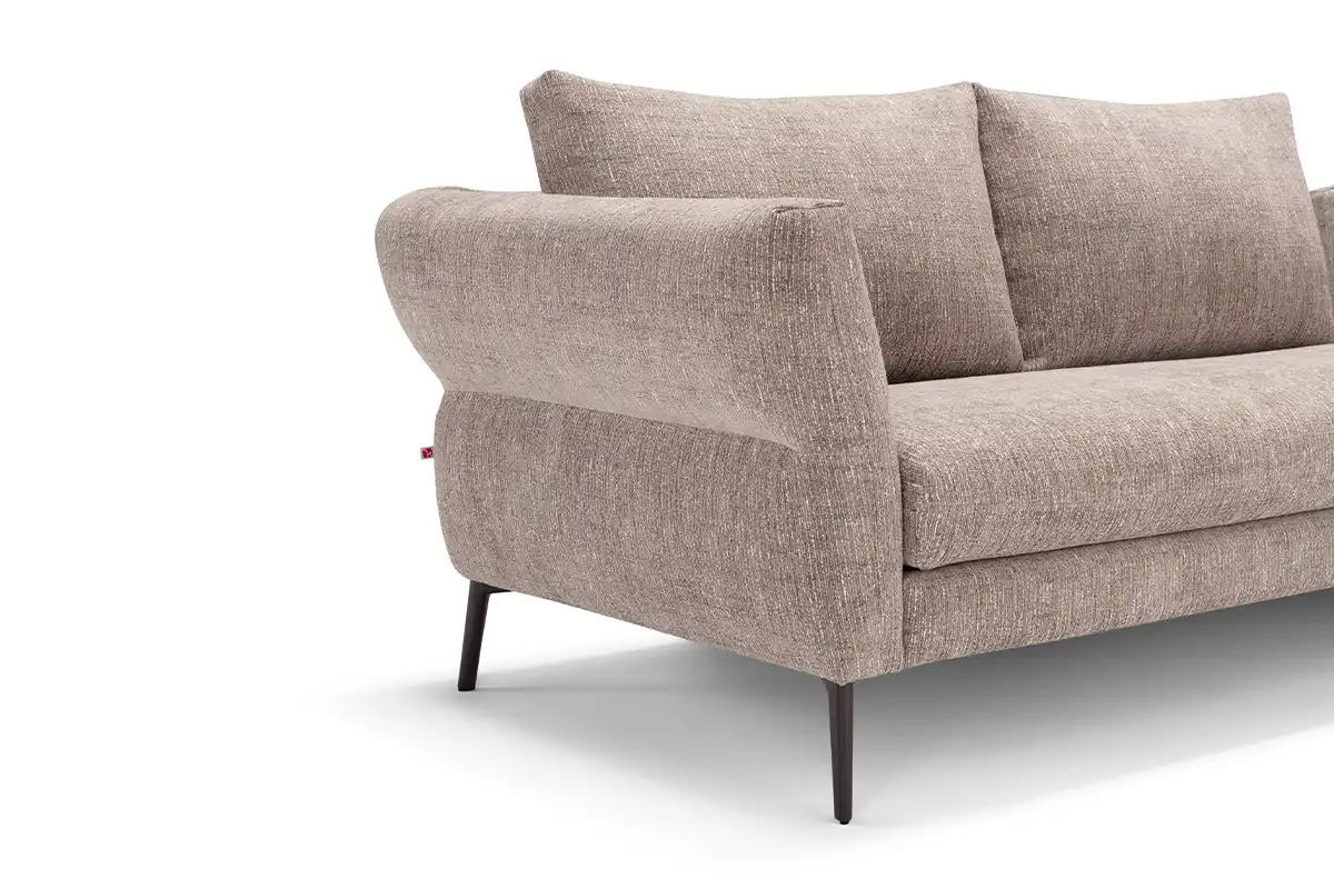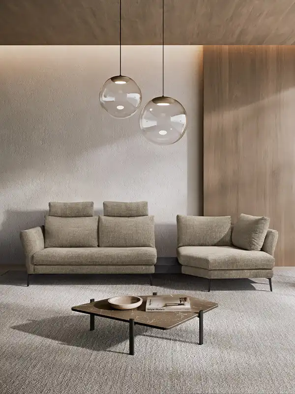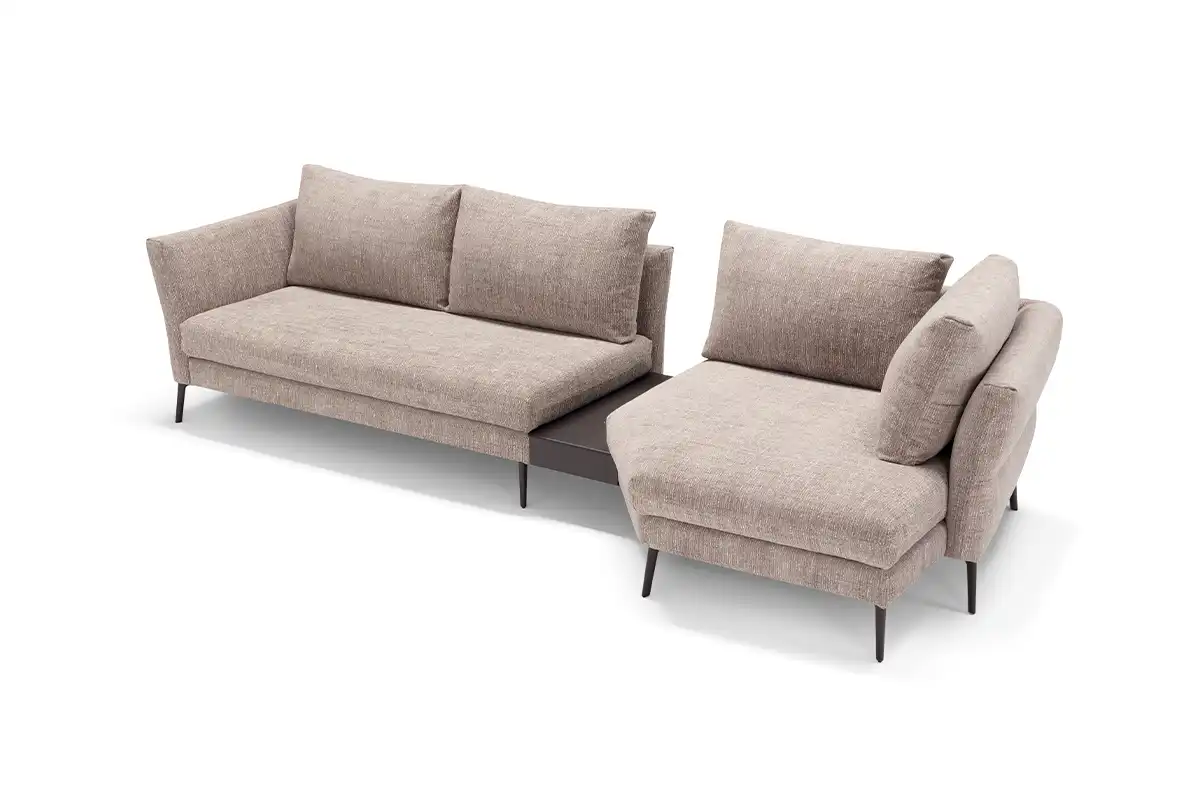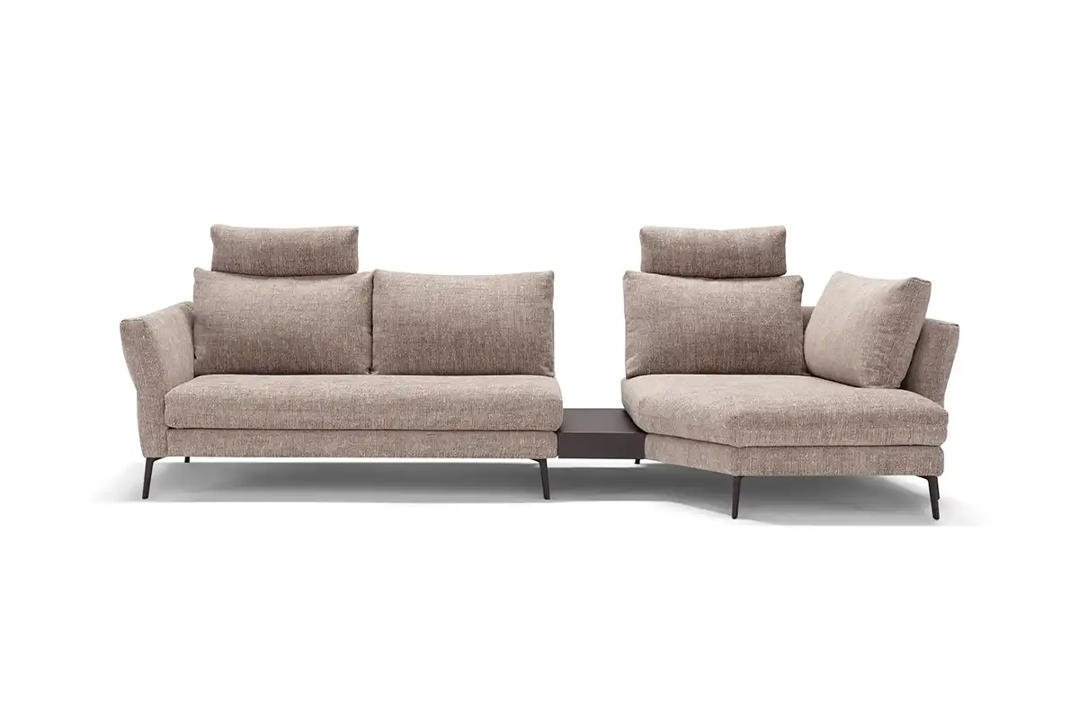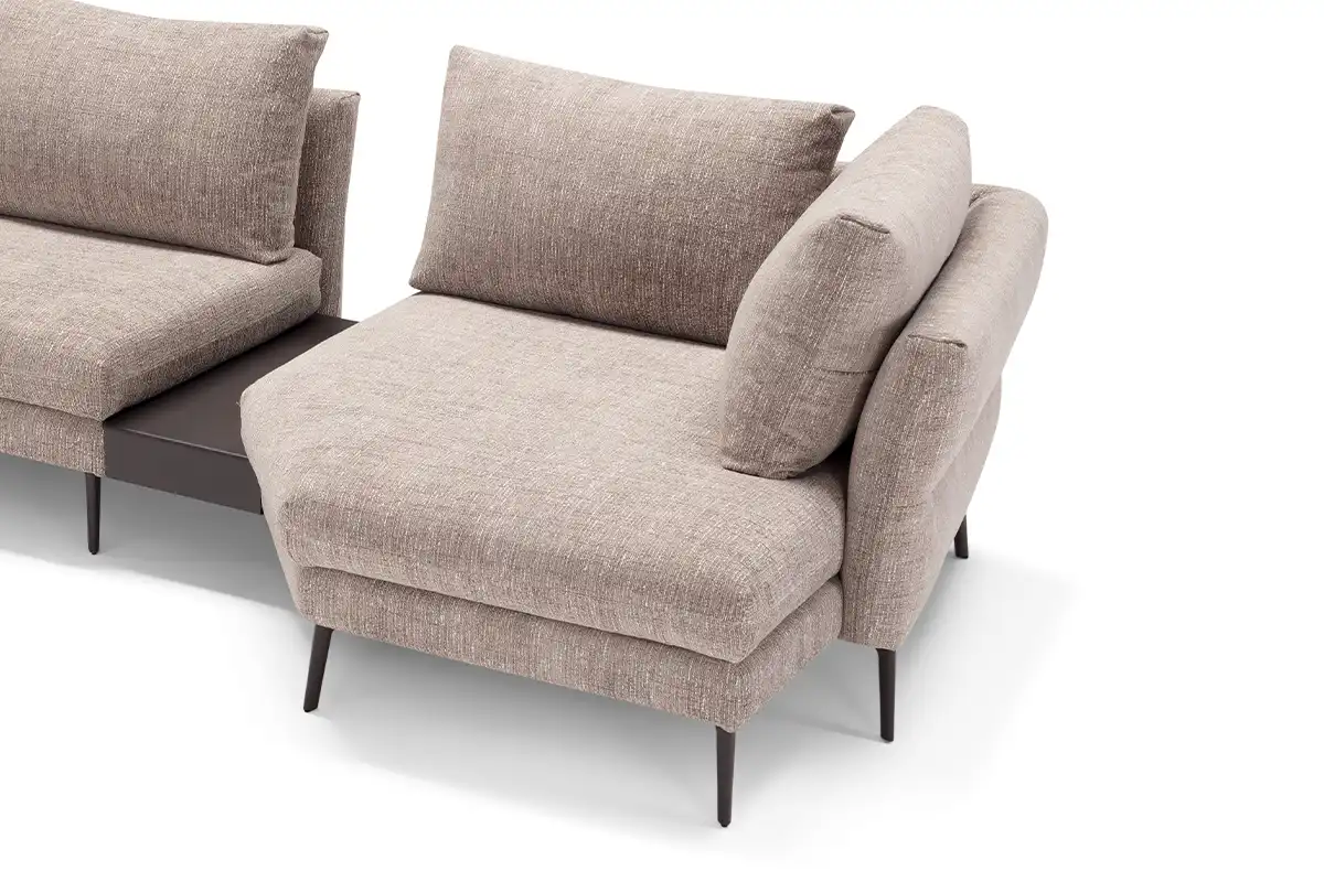 Pensato per arredare la zona giorno con versatilità, Vibe è un ampio divano tre posti ai quali abbiamo abbinato una penisola a base trapezoidale con spalliere. Queste ultime vanno a definire due ulteriori sedute, moltiplicando così il comfort e le possibilità d’uso di questo salotto. Particolarmente ricercato nel design e adatto ad essere apprezzato come centro stanza, Vibe si caratterizza per lo schienale, sul quale un’impuntura continua disegna due fasce orizzontali sovrapposte. Quella superiore, grazie ad un sapiente gioco di imbottiture, va a definire un profilo leggermente aggettante. Per un plus di comfort e funzionalità, è possibile aggiungere poggiatesta alle spalliere ed inserire come elemento di raccordo tra i singoli moduli un utile tavolino con ripiano in metallo, disponibile in due differenti finiture.