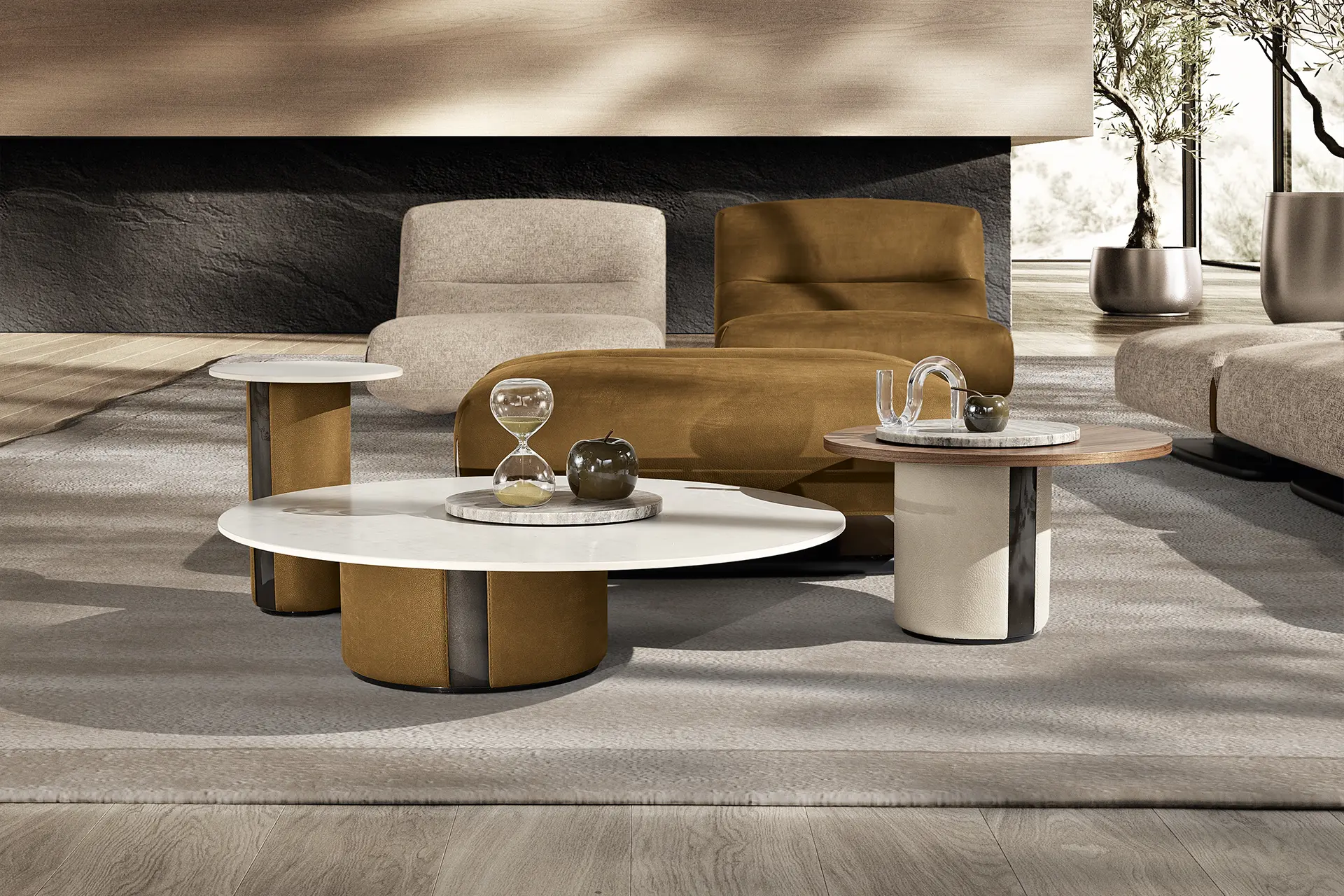 La combinazione ideale di forme e materiali, ripiani in gres e legno, strutture rivestite in tessuto e pelle e dettaglio in acciaio, tantissime combinazioni di colori per ogni esigenza di gusto.