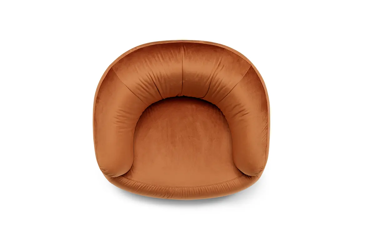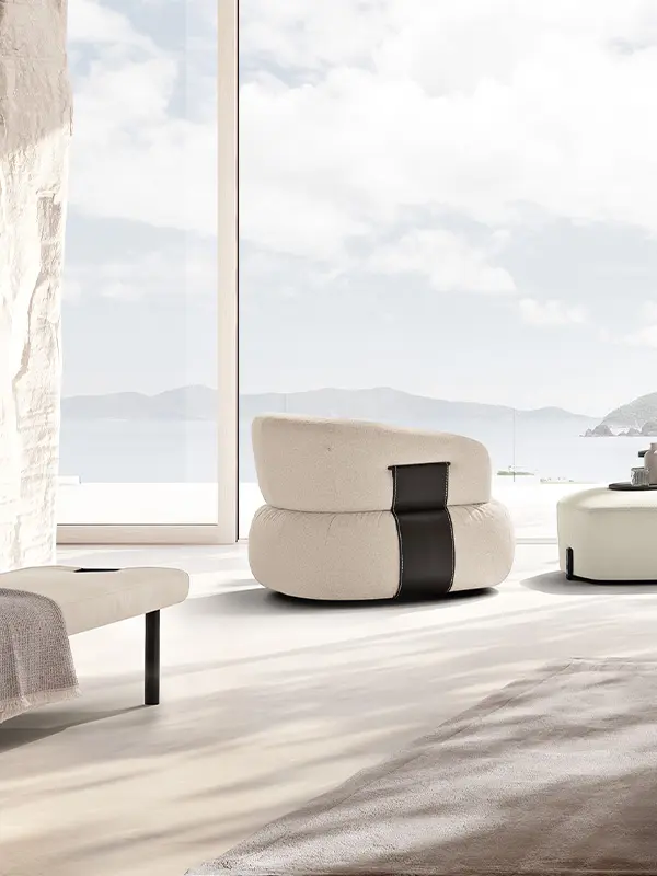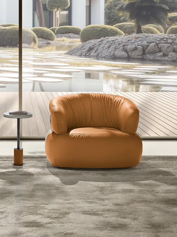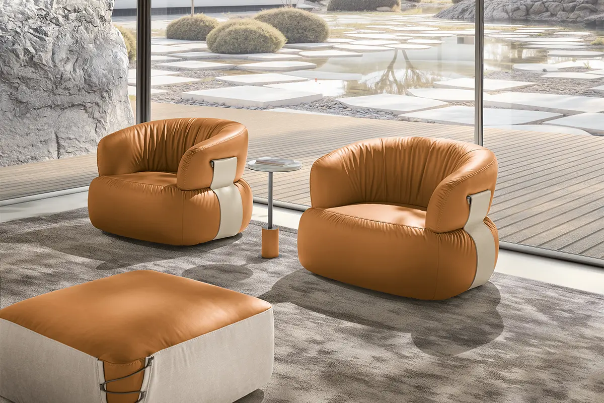 Volumi pieni e morbidi per la poltrona Dana che unisce la raffinatezza nella lavorazione sartoriale all’estremo comfort. Solida e dalle generose rotondità, il design è caratterizzato dal dettaglio di raffinate fasce di pelle cucite in entrambi i lati, a collegare la seduta alla spalliera