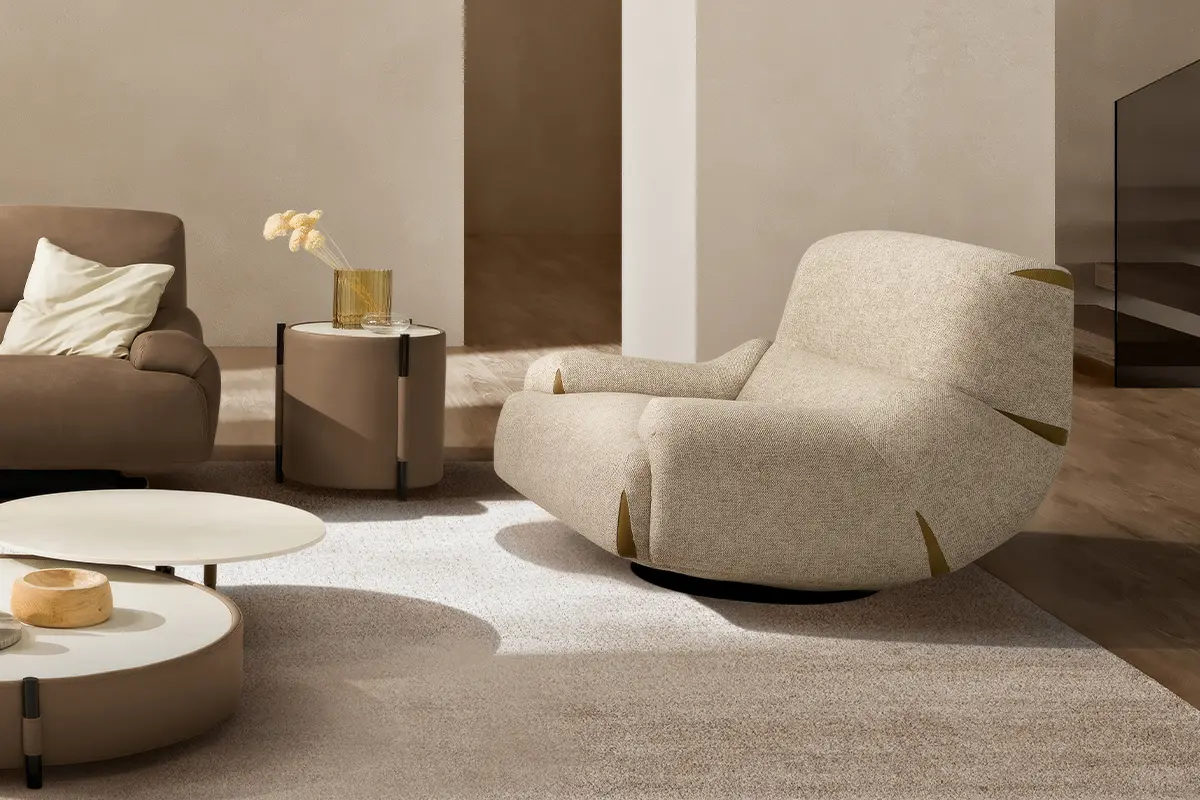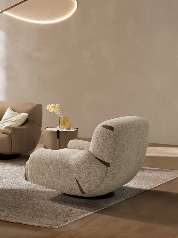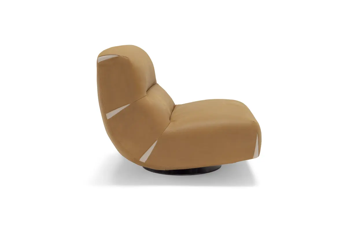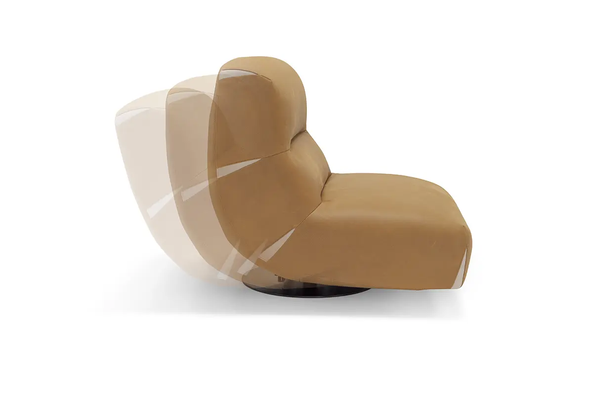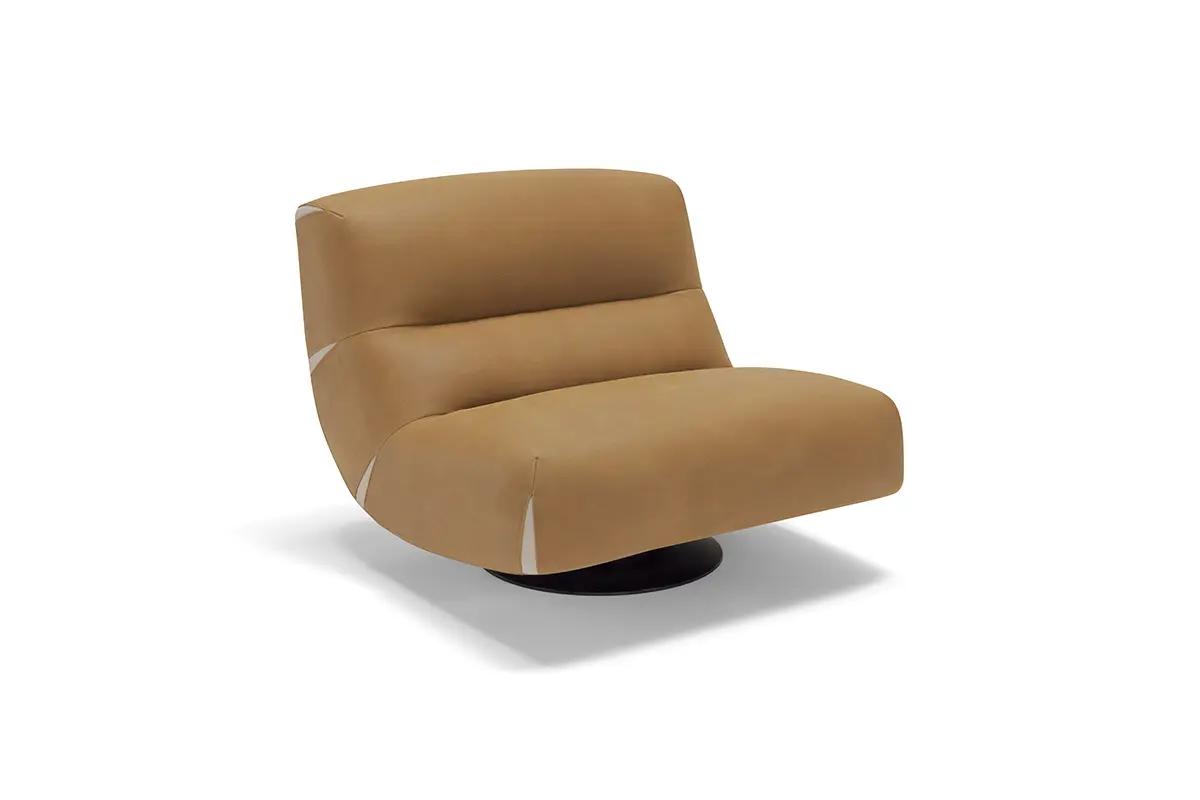 Poltrona confortevole ed elegante con movimento girevole e oscillante, rivestita in pregiata pelle nubuk con base in acciaio nero opaco.