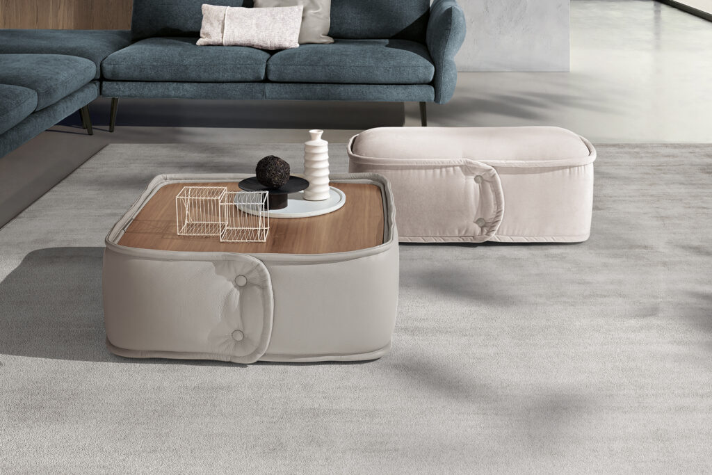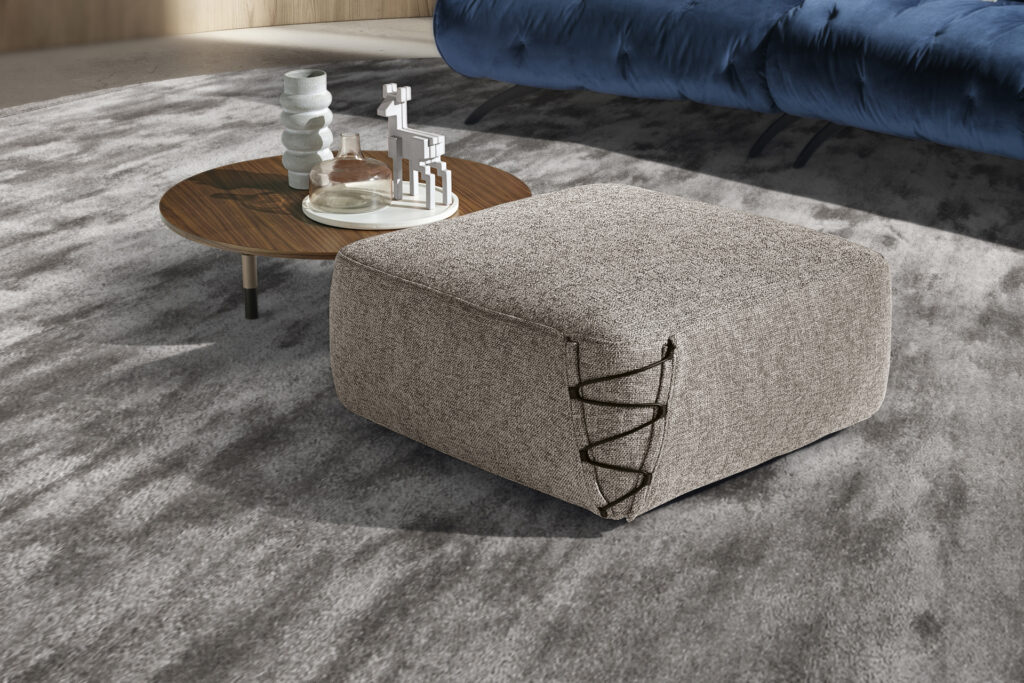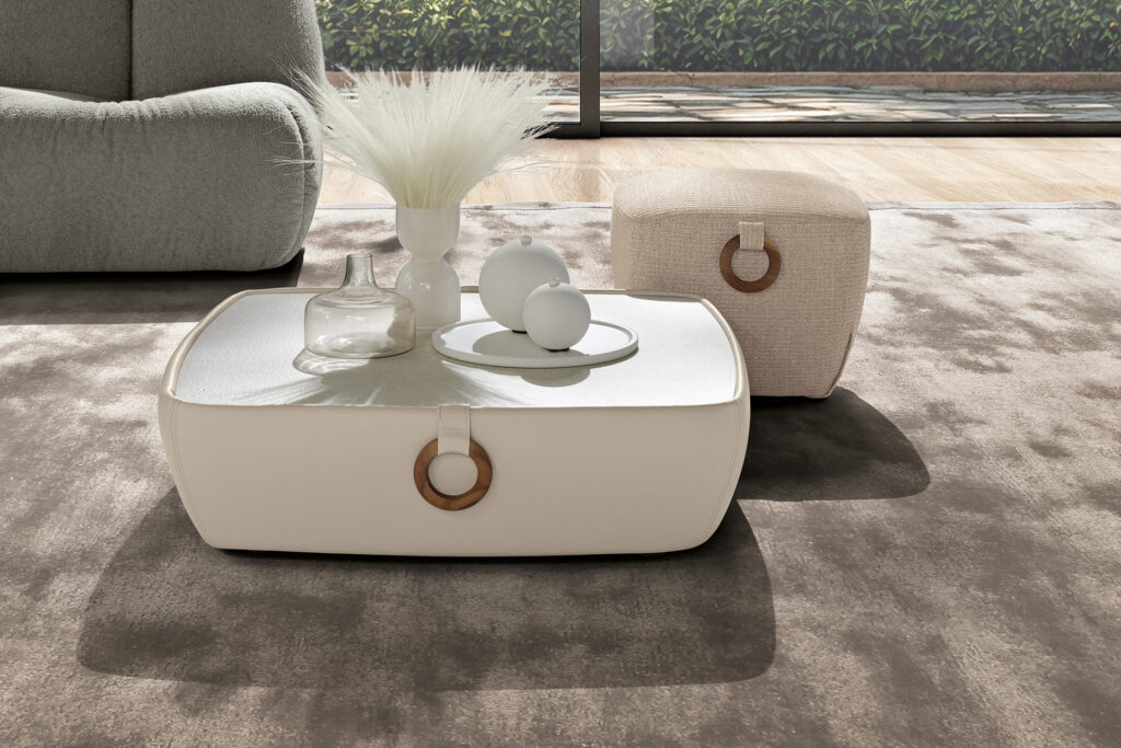 Avvolti in un’ampia fascia chiusa da due bottoni decorativi, i pouf e i tavolini da…